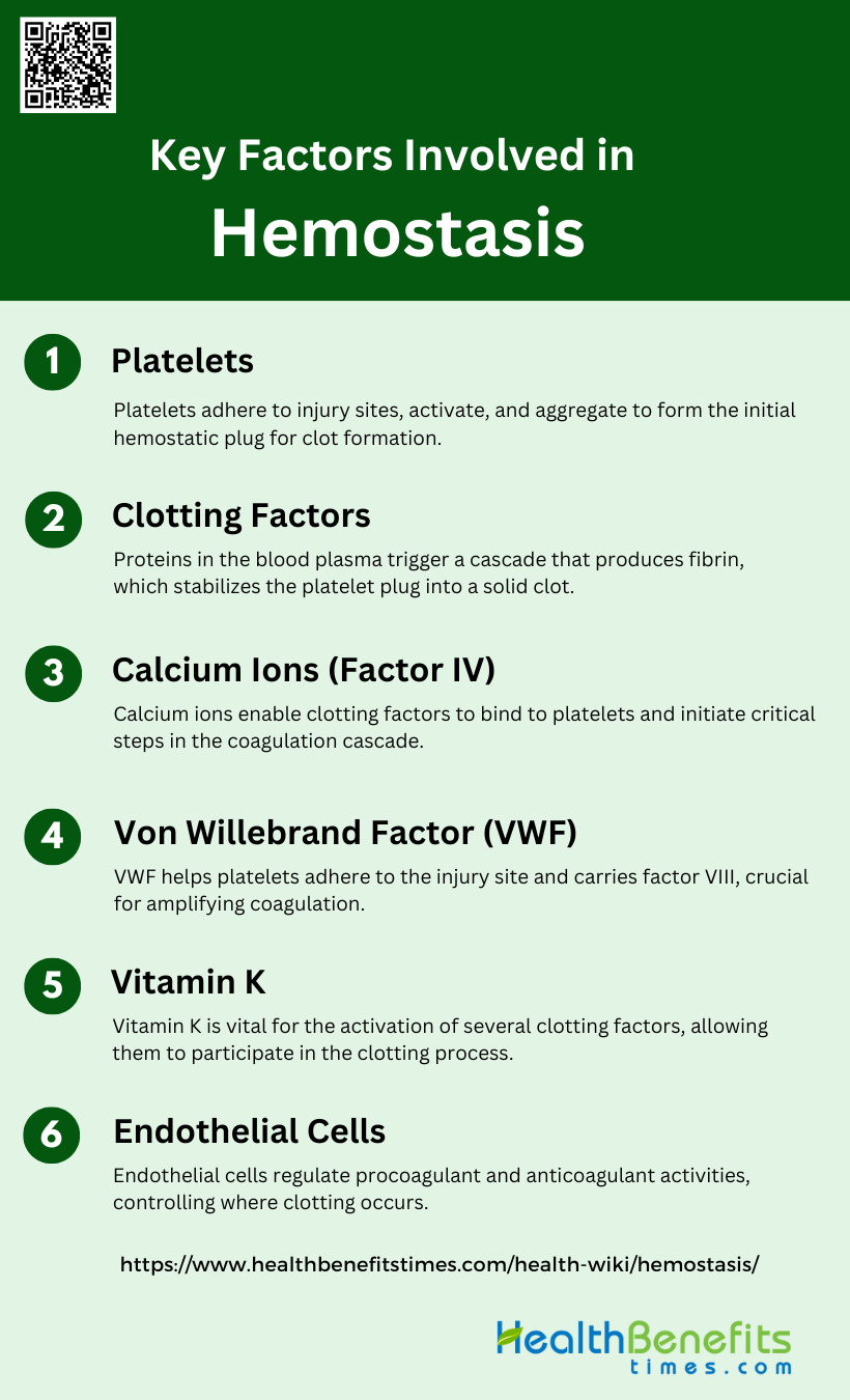 Hemostasis is a complex process that involves various components working together to prevent and stop bleeding. Each component plays a specific role in ensuring the effective formation and stabilization of a blood clot. The key factors involved in hemostasis include: