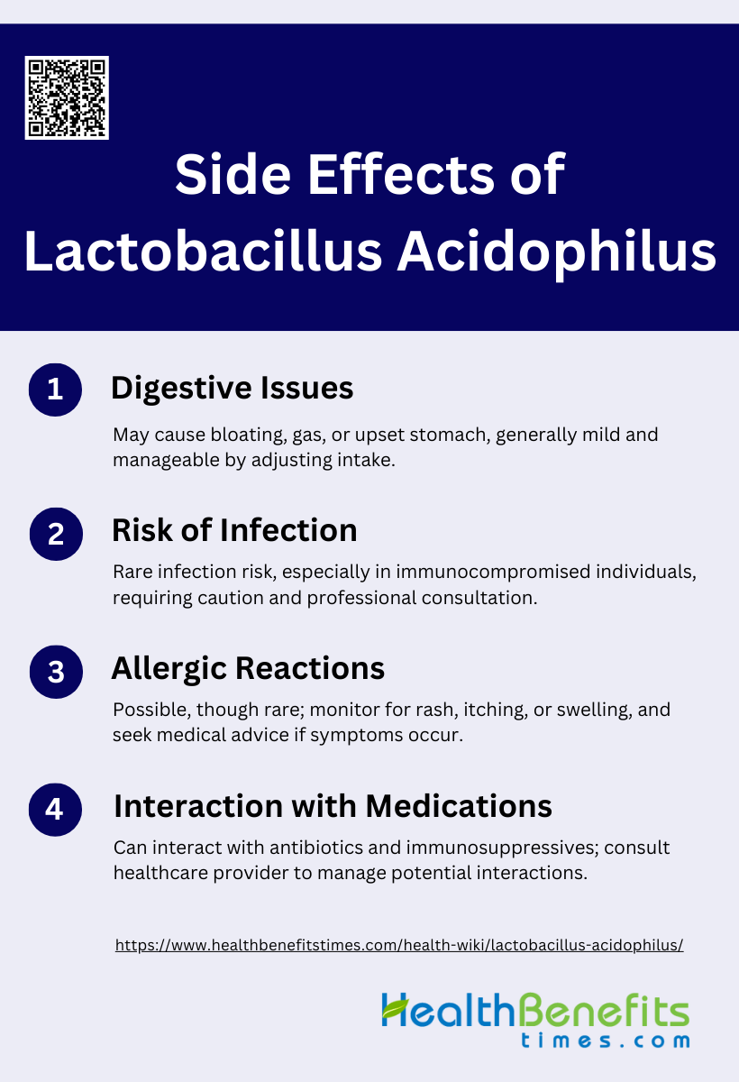 Allergic reactions to Lactobacillus acidophilus are uncommon but possible. Symptoms to watch for include rash, itching, and swelling. If any of these symptoms occur, it is important to discontinue use and consult a healthcare provider immediately. Monitoring for these signs can help in early detection and management of allergic reactions.