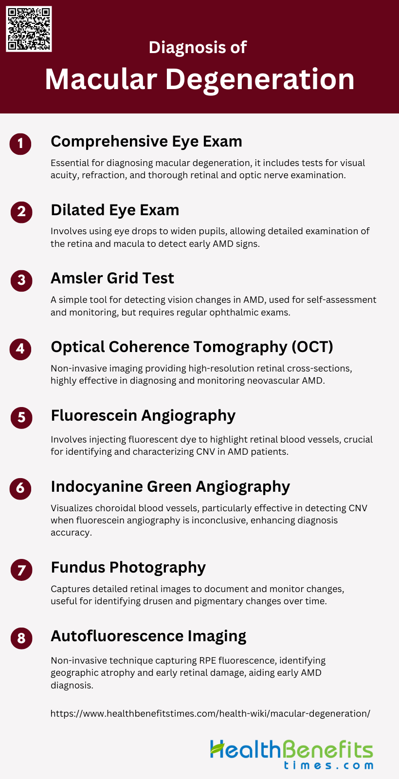 Macular degeneration is a common eye condition that primarily affects older adults, leading to loss of central vision. Early diagnosis is crucial for managing the progression of the disease and maintaining quality of life. The following steps outline the typical diagnostic process for macular degeneration: