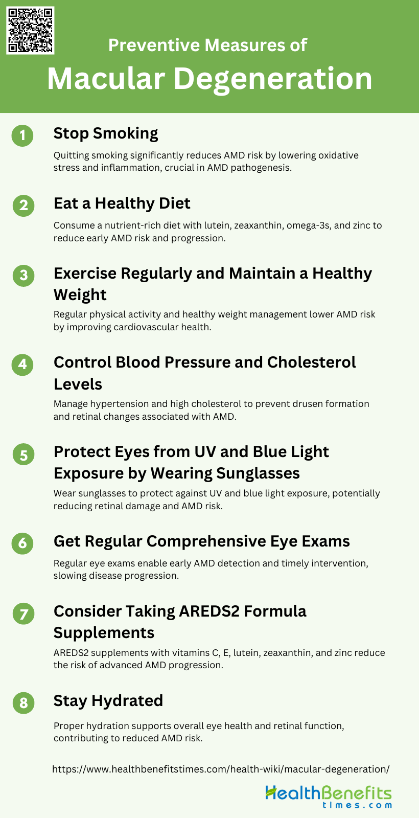 Macular degeneration is a leading cause of vision loss, but certain preventive measures can help reduce the risk. Adopting a healthy lifestyle and regular eye check-ups are essential. Here are some key preventive measures to consider: