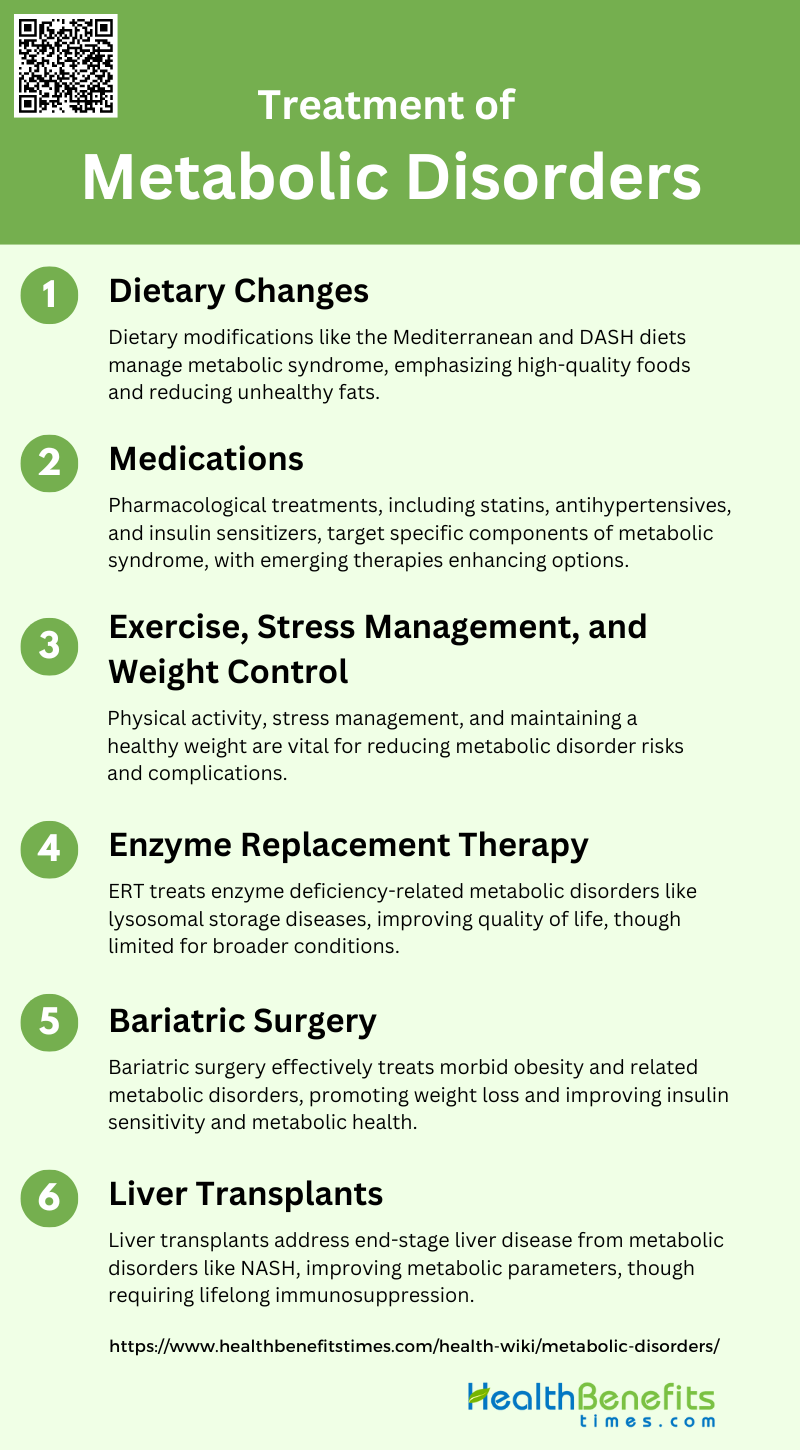 The treatment of metabolic disorders involves a multifaceted approach tailored to the specific condition and individual needs. Common strategies include lifestyle modifications, medication, and sometimes surgical interventions. Below are some of the primary treatment methods for managing metabolic disorders:
