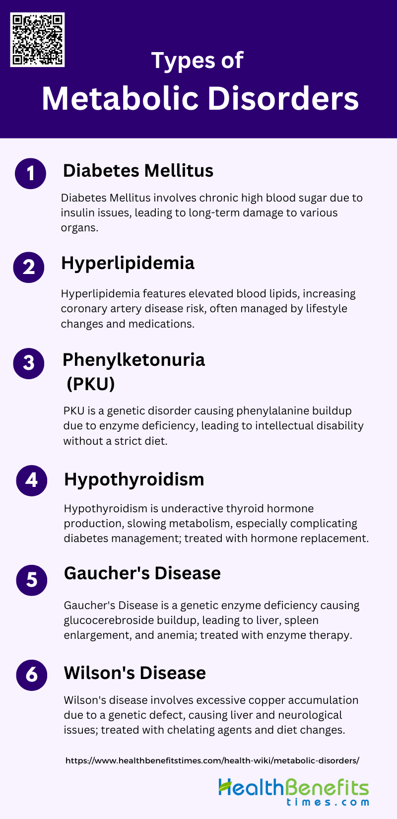 These disorders can be genetic or acquired and affect the body’s ability to perform essential biochemical reactions. Below are some common types of metabolic disorders: