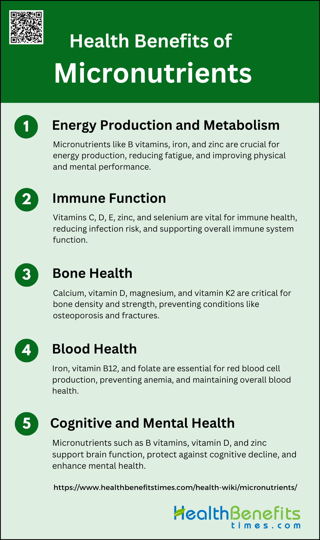 Micronutrients are vital nutrients required in small quantities for numerous bodily functions. They contribute significantly to energy production, immune defense, bone strength, blood health, and cognitive function. Below is a list of key health benefits of micronutrients: