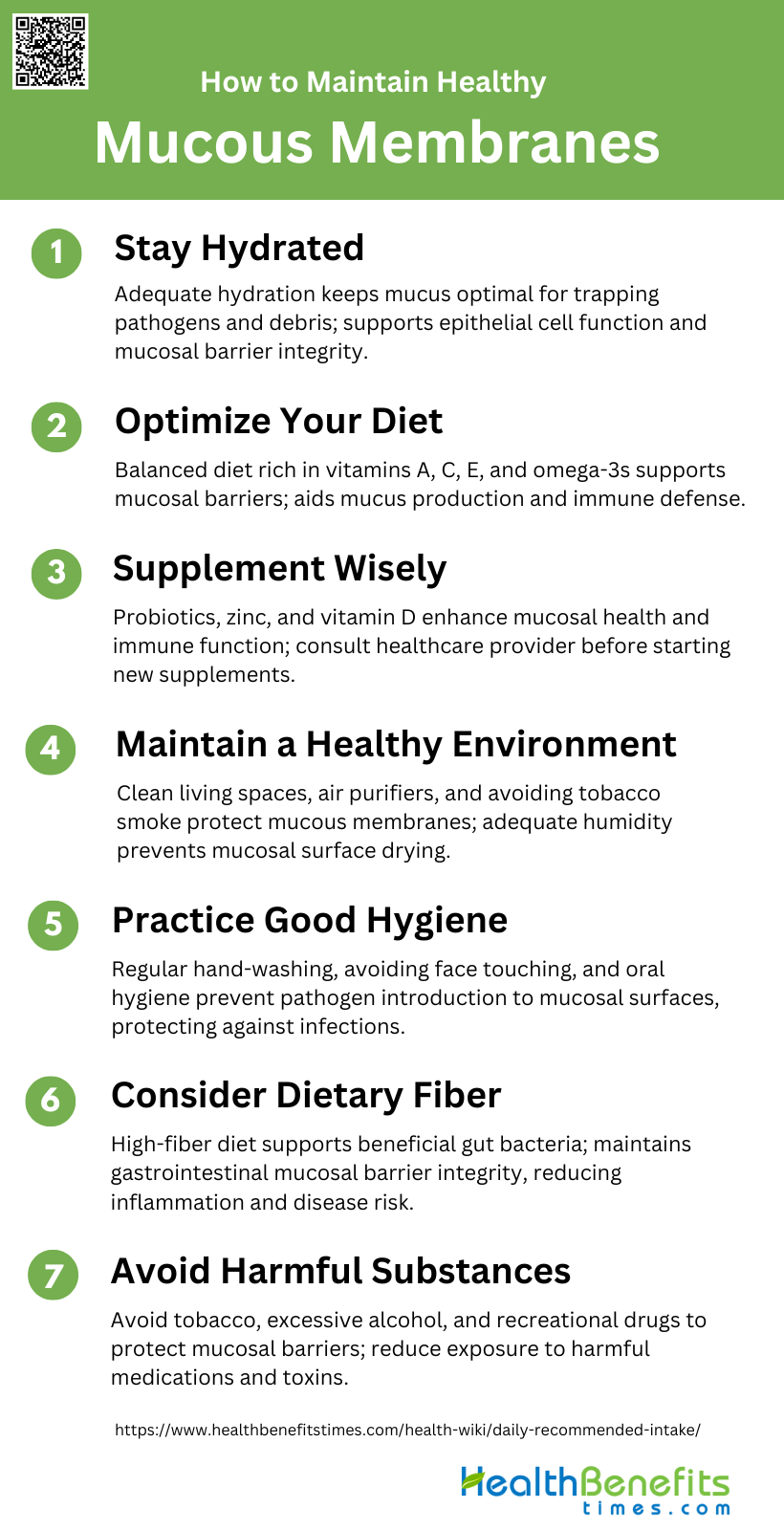 A balanced diet rich in essential nutrients supports the health of mucous membranes. Nutrients such as vitamins A, C, and E, along with omega-3 fatty acids, play a significant role in maintaining the integrity and function of mucosal barriers. These nutrients help in the production and maintenance of mucus and support the immune system in defending against pathogens. A diet that includes a variety of fruits, vegetables, and healthy fats can contribute to the resilience of mucous membranes .