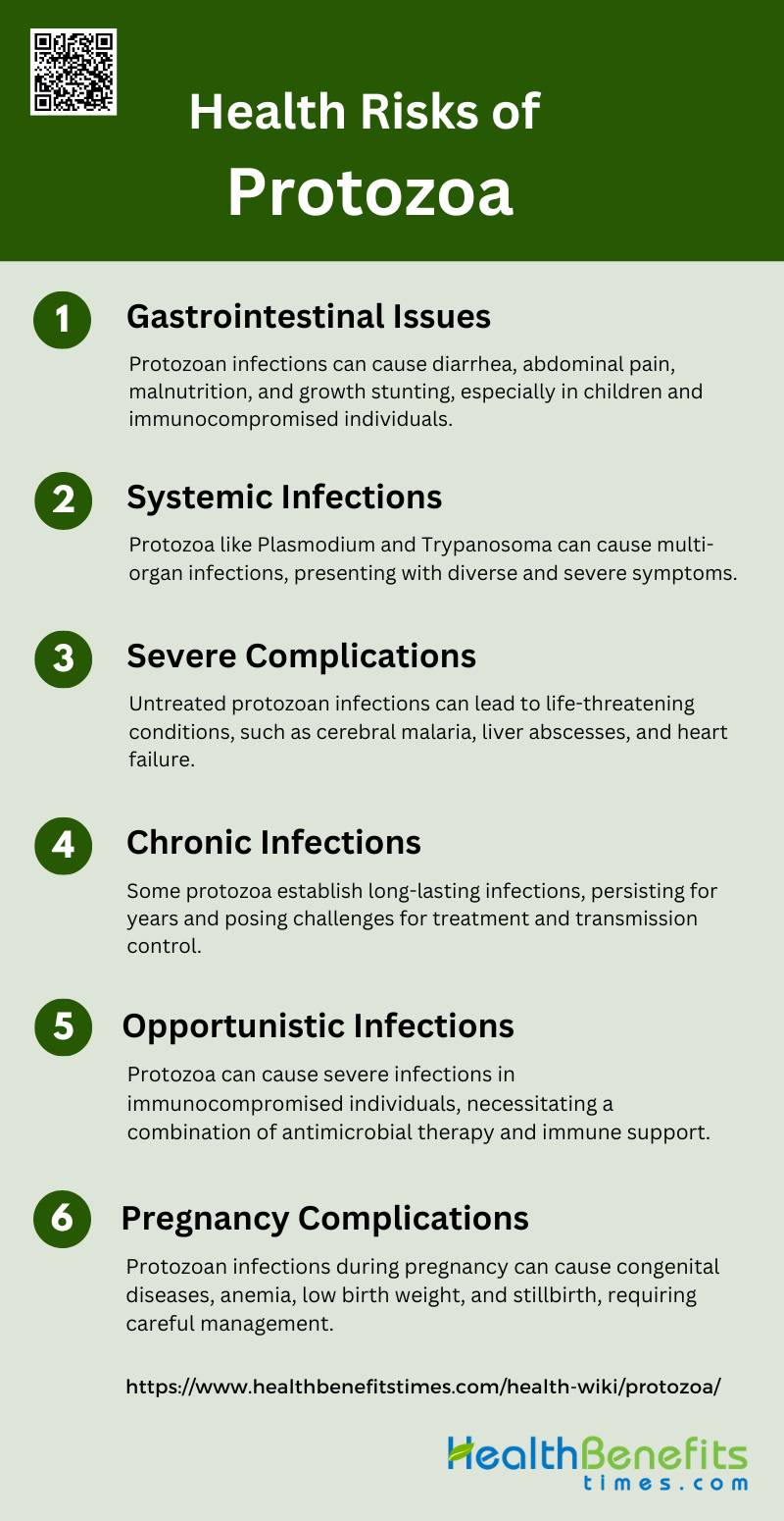 Protozoan infections pose significant health risks, affecting various systems in the body. These infections can lead to a range of health issues, from mild gastrointestinal disturbances to severe systemic complications. Below are some of the key health risks associated with protozoa: