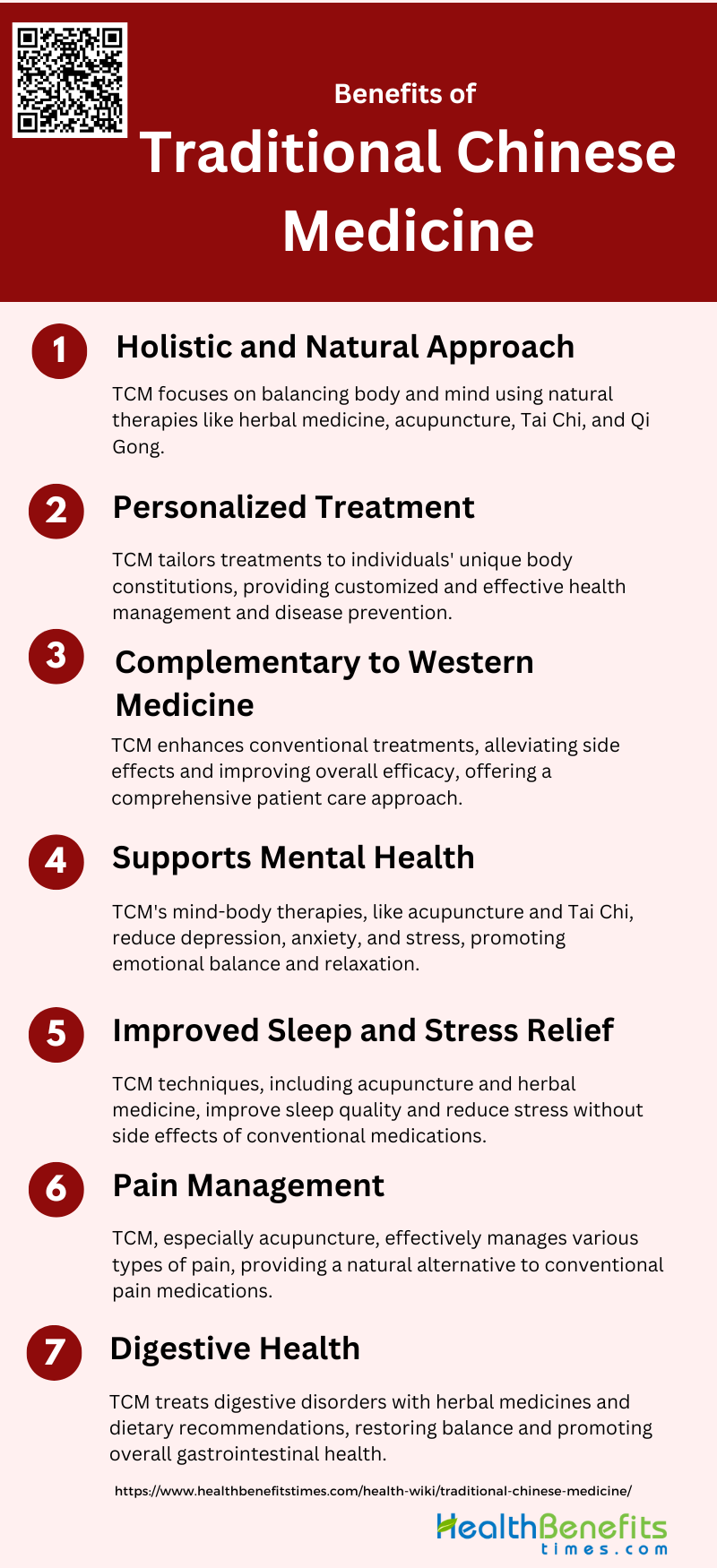 Traditional Chinese Medicine (TCM) offers a holistic approach to health and wellness, emphasizing the balance of mind, body, and spirit. It has been practiced for thousands of years and includes various treatments such as acupuncture, herbal medicine, and tai chi. Here are some key benefits of TCM: