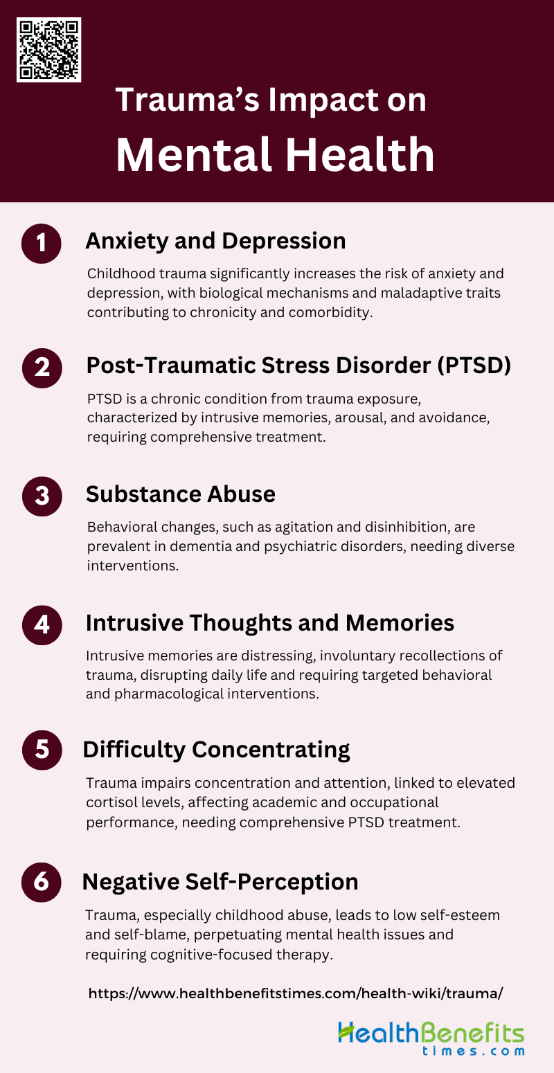 Trauma can have profound and lasting effects on an individual’s mental health, influencing various aspects of their emotional and psychological well-being. Understanding these impacts is essential for providing appropriate care and support. Below is a list of common mental health issues resulting from trauma: