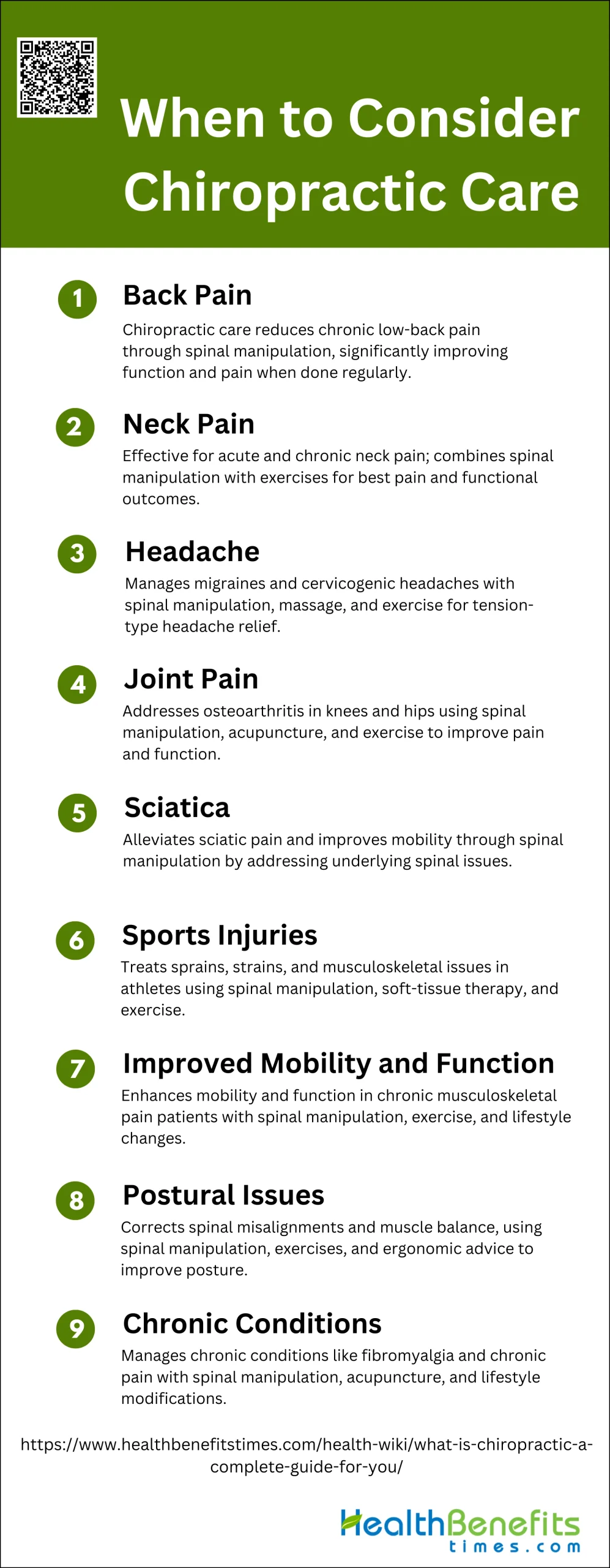 Chiropractic care can be a beneficial treatment option for various health issues, particularly those related to the musculoskeletal system. It focuses on diagnosing and treating mechanical disorders of the spine and other joints. Here are some situations when you might consider chiropractic care: