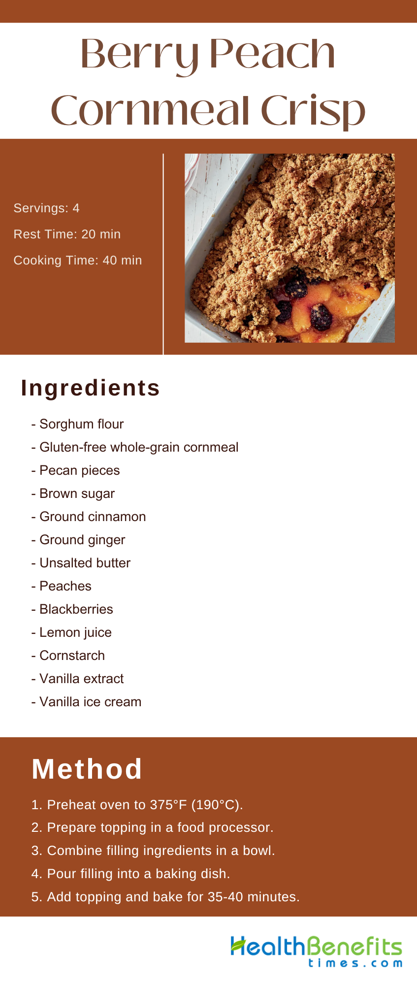 The "Berry Peach Cornmeal Crisp" is a dessert that has sweetness of peaches with blackberries with topping. This dish lures its lineage from the classic fruit crisp, a beloved main in American dessert cuisine. Typically served as a dessert, it fits into the repertoire of both casual family dinners and more formal meal settings. The recipe calls for a blend of sorghum flour, gluten-free cornmeal, toasted pecans, spices, and butter for the topping, alongside a fruity filling made from fresh peaches, blackberries, and a hint of lemon juice, thickened slightly with cornstarch and enriched with vanilla. The preparation process is straightforward: mix the topping, toss the fruit for the filling, layer in a baking dish, and bake. A delightful flavor where the sweetness of the fruit perfectly complements the spiced, buttery, and crunchy topping.