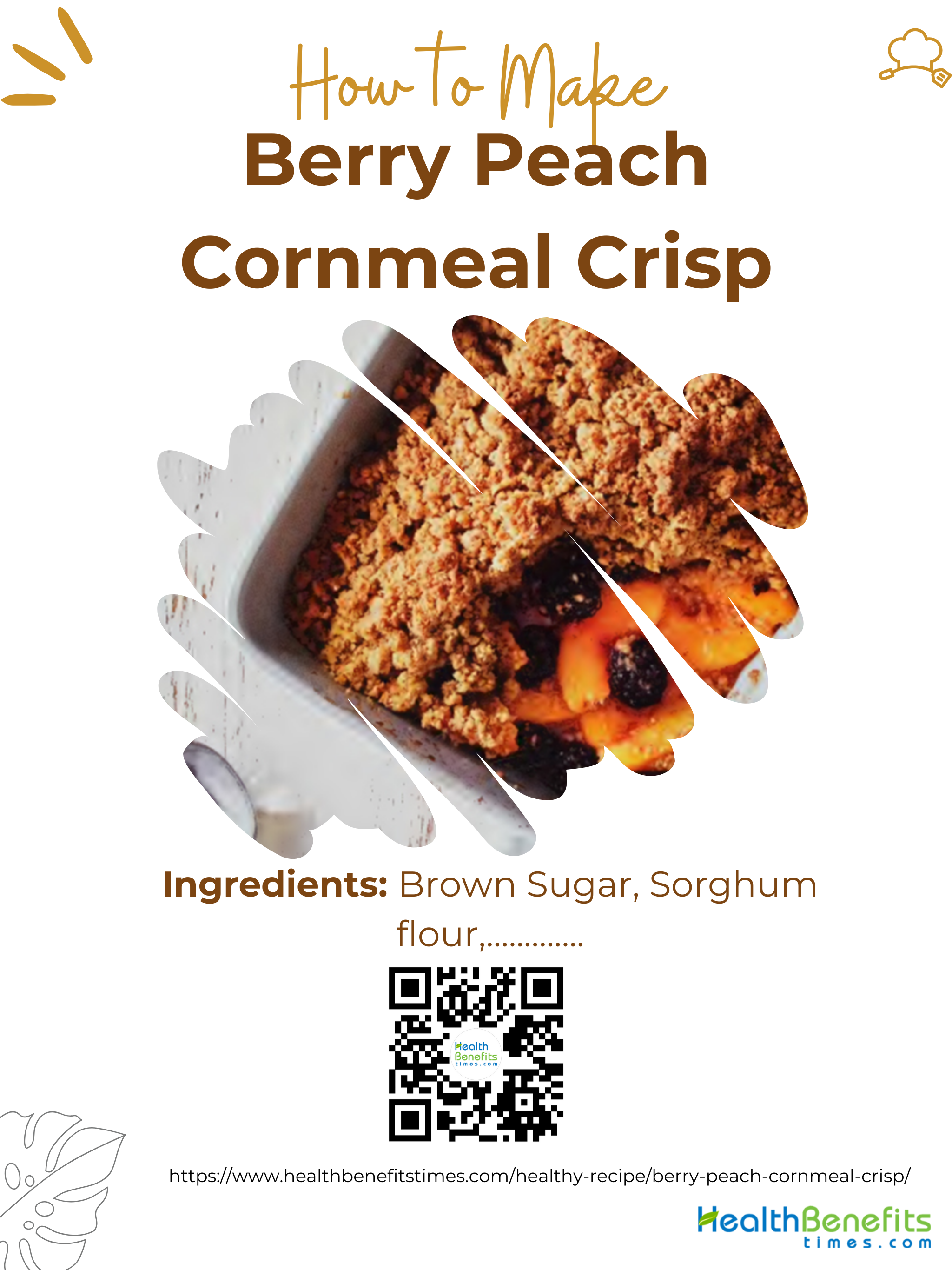 The "Berry Peach Cornmeal Crisp" is a dessert that has sweetness of peaches with blackberries with topping. This dish lures its lineage from the classic fruit crisp, a beloved main in American dessert cuisine. Typically served as a dessert, it fits into the repertoire of both casual family dinners and more formal meal settings. The recipe calls for a blend of sorghum flour, gluten-free cornmeal, toasted pecans, spices, and butter for the topping, alongside a fruity filling made from fresh peaches, blackberries, and a hint of lemon juice, thickened slightly with cornstarch and enriched with vanilla. The preparation process is straightforward: mix the topping, toss the fruit for the filling, layer in a baking dish, and bake. A delightful flavor where the sweetness of the fruit perfectly complements the spiced, buttery, and crunchy topping.