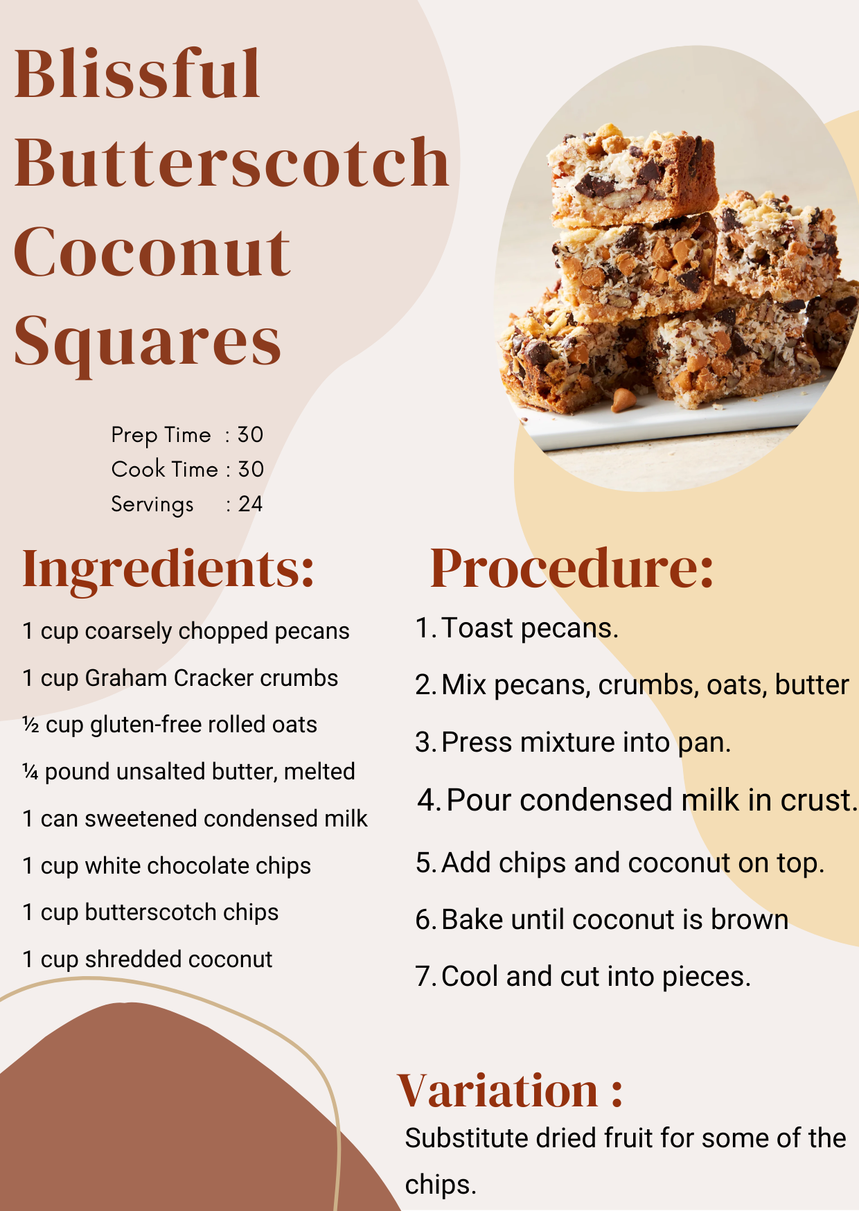 Blissful Butterscotch Coconut Squares, a recipe flavors of butterscotch and white chocolate with the tropical taste of coconut, on a nutty, gluten-free base. This treat, yielding 2 to 3 dozen squares, is a perfect blend of crunch and creaminess, requiring only 15 minutes of active time and an hour from start to finish. The process begins with toasting pecans to unlock their deep flavors, followed by layering a buttery Graham Cracker and oat crust with sweetened condensed milk, then sprinkling with chips and coconut before baking to golden perfection. Ideal for any occasion, these squares offers a twist on tradition by allowing for the substitution of chips with dried fruit or raisins, making every bite a delightful surprise. This recipe is not just a dessert; it's a journey through a landscape of textures and tastes.