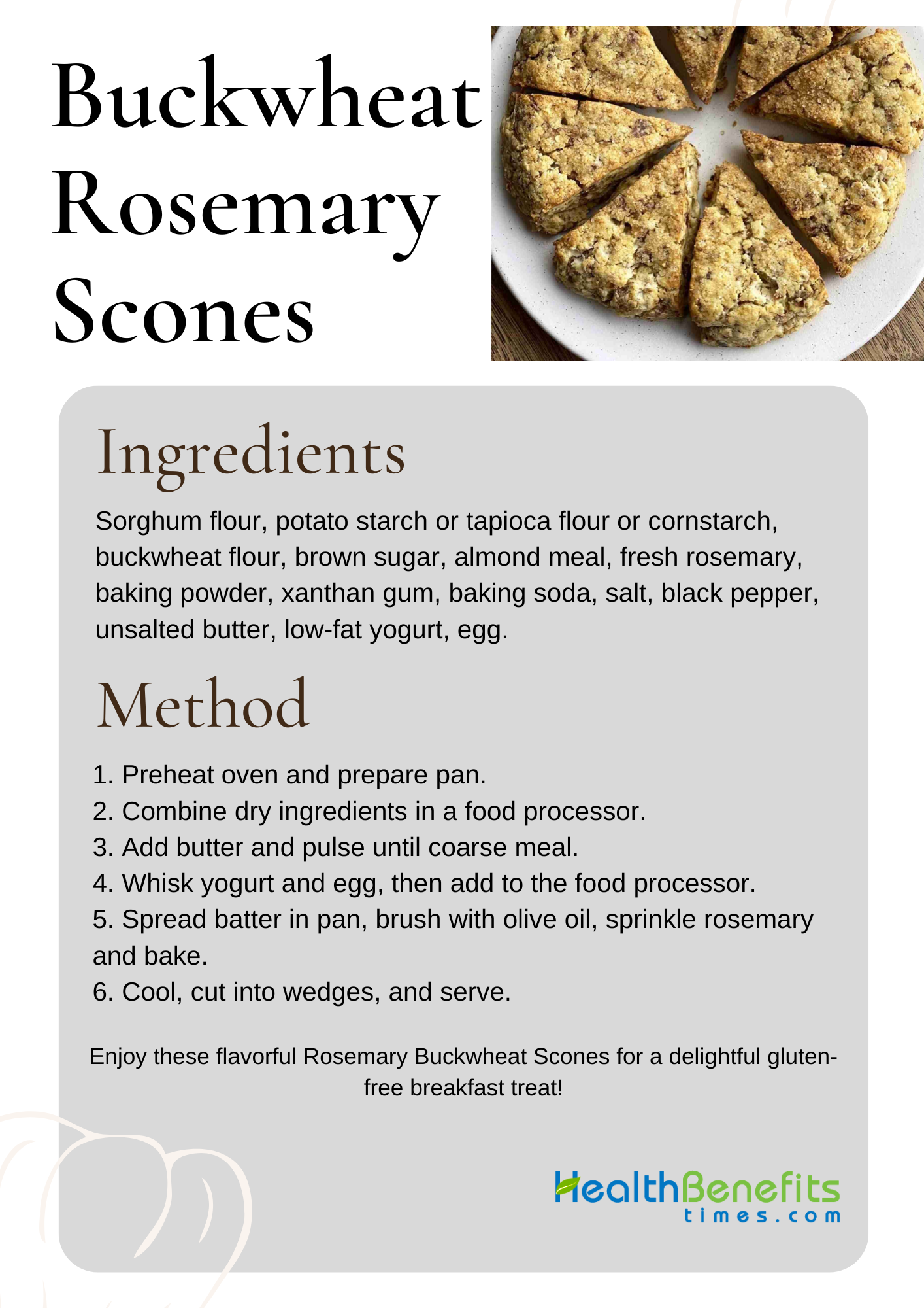 "Savory Rosemary and Buckwheat Scones" are a dish on the traditional British scone, filling flavors. This recipe turns from sweet scone by support of sorghum and buckwheat flours, both known for their health benefits and gluten-free properties. With rosemary, these scones join the herb with the almond meal and butter. The addition of yogurt and egg presents dough. Prepared with olive oil and a sprinkle of rosemary, salt, and pepper before baking. The taste is a harmony of savory notes, where the rosemary sets with buckwheat and sorghum, interrupted by brown sugar and yogurt.