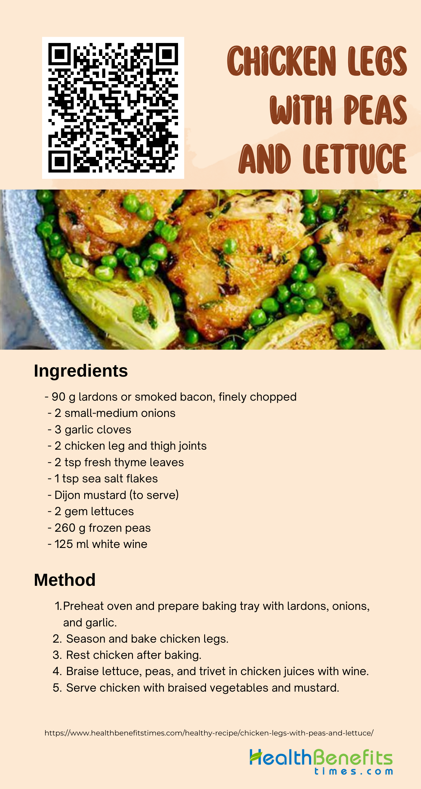 Chicken Legs with Peas and Lettuce is a dish that serves two. It starts with a base, or 'trivet,' of finely chopped lardons or smoked bacon, onions, and garlic arranged on a baking tray. This base not only supports two juicy chicken legs seasoned with fresh thyme leaves and sea salt but also imbues them with a depth of flavor as they roast in the oven. After roasting, the chicken is set aside to rest. Meanwhile, the same flavorful base is transferred to a saucepan. The addition of white wine elevates the mixture. Once the lettuce has softened and the peas are heated through, the dish is complete. Each serving of chicken is plated over the braised greens and peas, finished with a touch of Dijon mustard for a burst of tangy flavor.