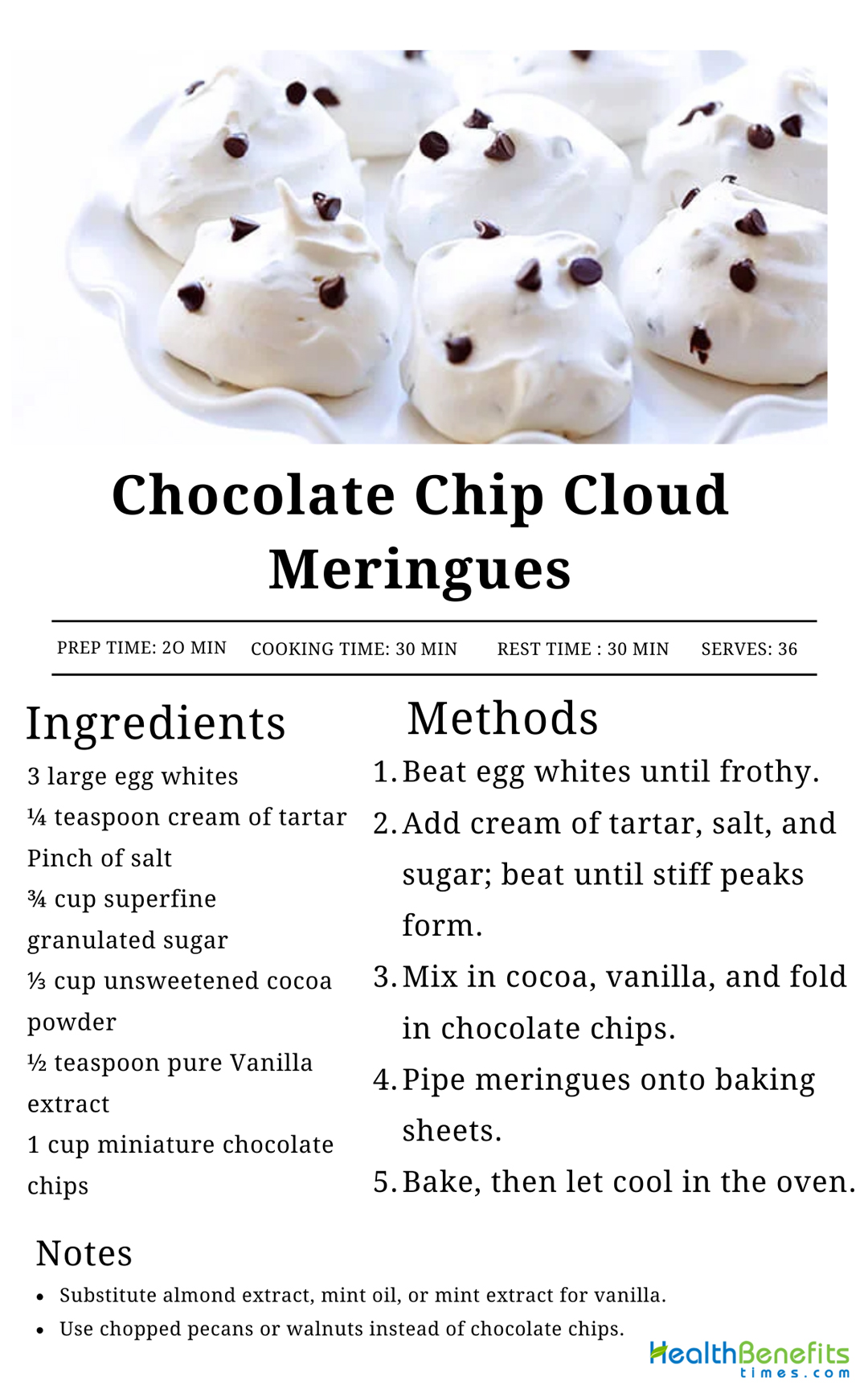 Chocolate Chip Cloud Meringues, a recipe that is heavenly texture with every bite and a yield of three dozen in just 1½ hours. This journey begins with a low-temperature oven, setting the stage for the transformation of simple ingredients into exquisite treats. Egg whites are whipped into a frenzy, achieving glossy stiff peaks with the careful addition of superfine sugar, while unsweetened cocoa powder and pure vanilla extract infuse the meringue with deep flavors, complemented by the sweet surprise of miniature chocolate chips folded into the mix. Piped onto baking sheets and gently baked, these meringues emerge as light, cloud-like confections, dotted with chocolate chips that offer a delightful crunch. For those seeking variation, the recipe offers alternatives such as almond extract or mint for the vanilla, or chopped nuts in place of chocolate chips, allowing each baker to tailor the meringues to their taste. Chocolate Chip Cloud Meringues are not just a dessert; they are an invitation to explore the delicate balance of flavor and texture.