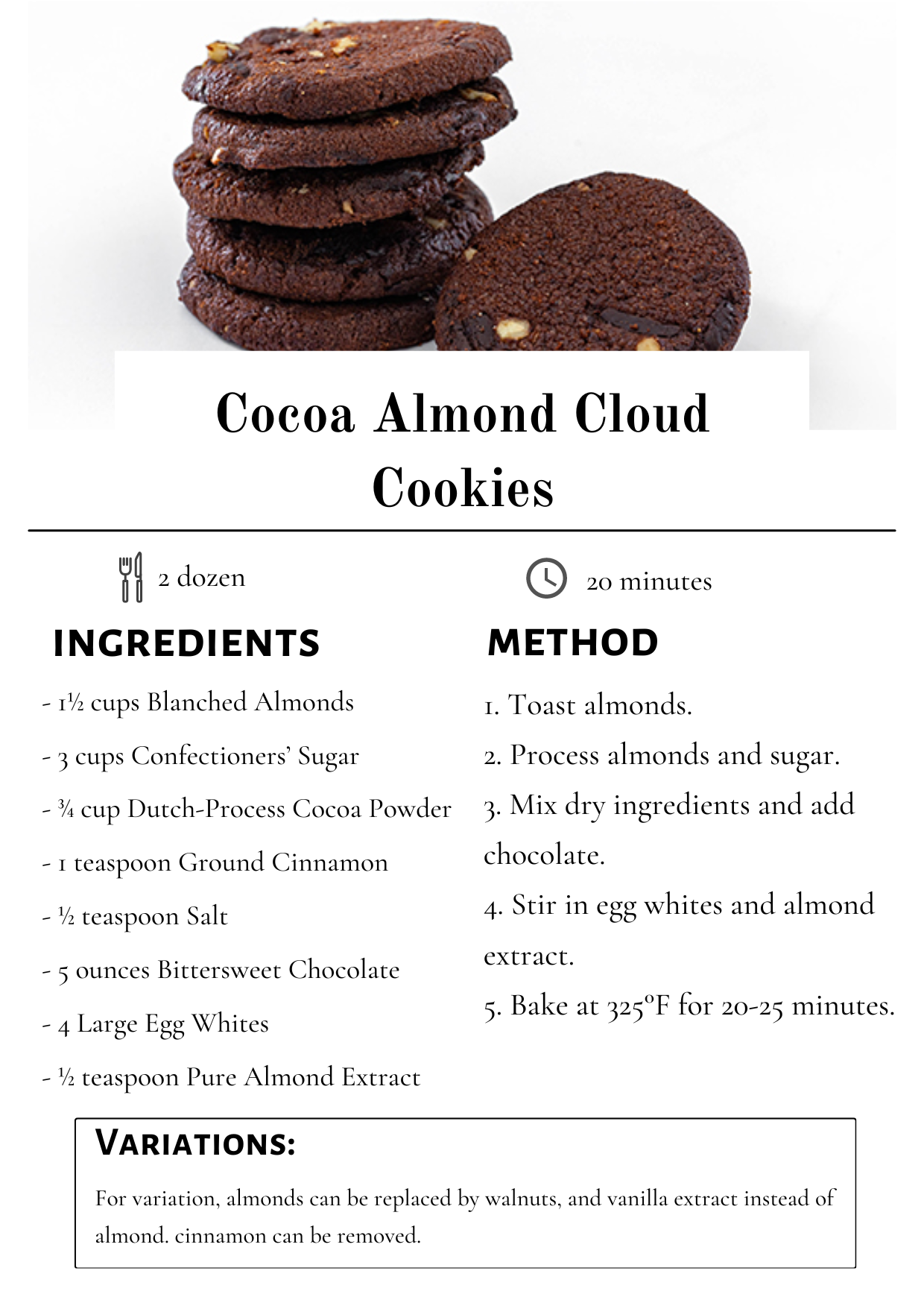 Venture into the enchanting world of baking with the Cocoa Almond Cloud Cookies recipe, a divine confection that promises to elevate your dessert repertoire. In just 20 minutes of active preparation and a total of 40 minutes from start to finish, you will create 2 dozen ethereal cookies that perfectly marry the richness of cocoa with the subtle, nutty undertones of blanched almonds. This recipe is a celebration of contrasts, blending the intense depth of Dutch-process cocoa powder and bittersweet chocolate with the light, airy texture achieved through the incorporation of whipped egg whites. Ground cinnamon adds a warm, spicy note, while pure almond extract deepens the nutty flavor profile, making each bite a complex yet harmonious experience. Ideal for those seeking a sophisticated twist on the classic chocolate cookie, the Cocoa Almond Cloud Cookies offer a gluten-free option that doesn’t compromise on taste or texture. Whether for a special occasion or a simple treat to brighten a day, these cookies promise to deliver a cloud of cocoa-almond bliss with every bite.