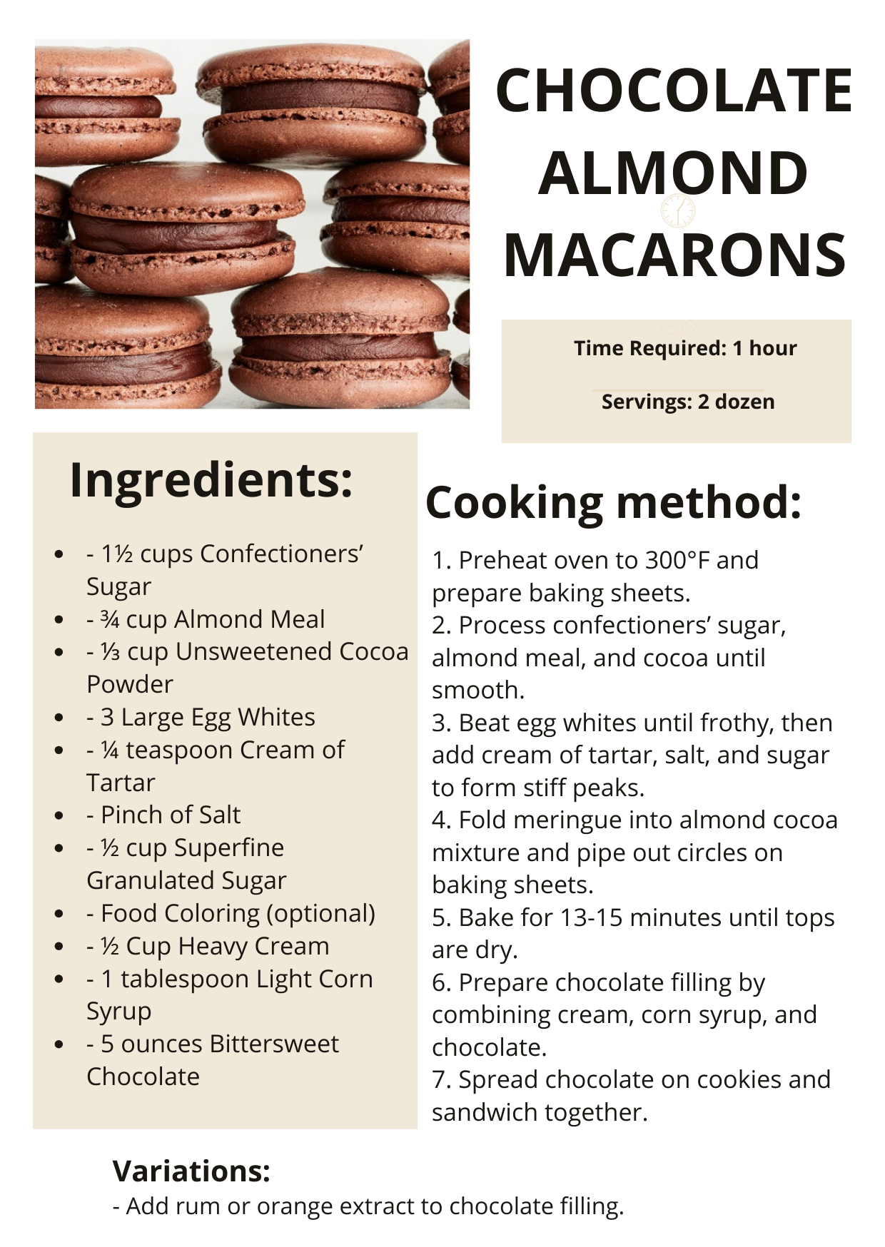 Mix Cocoa Bliss Macarons with Decadent Chocolate Filling. In just an hour, including 25 minutes of active kitchen time, you can create two dozen of treats. Starting with ingredient like confectioners’ sugar, almond meal, and cocoa powder, transform it into macarons. Dry mix the egg whites, and then baked. Transform the filling of heavy cream, corn syrup, and chopped bittersweet chocolate into crisp macaron shells. Customize it if wanted.