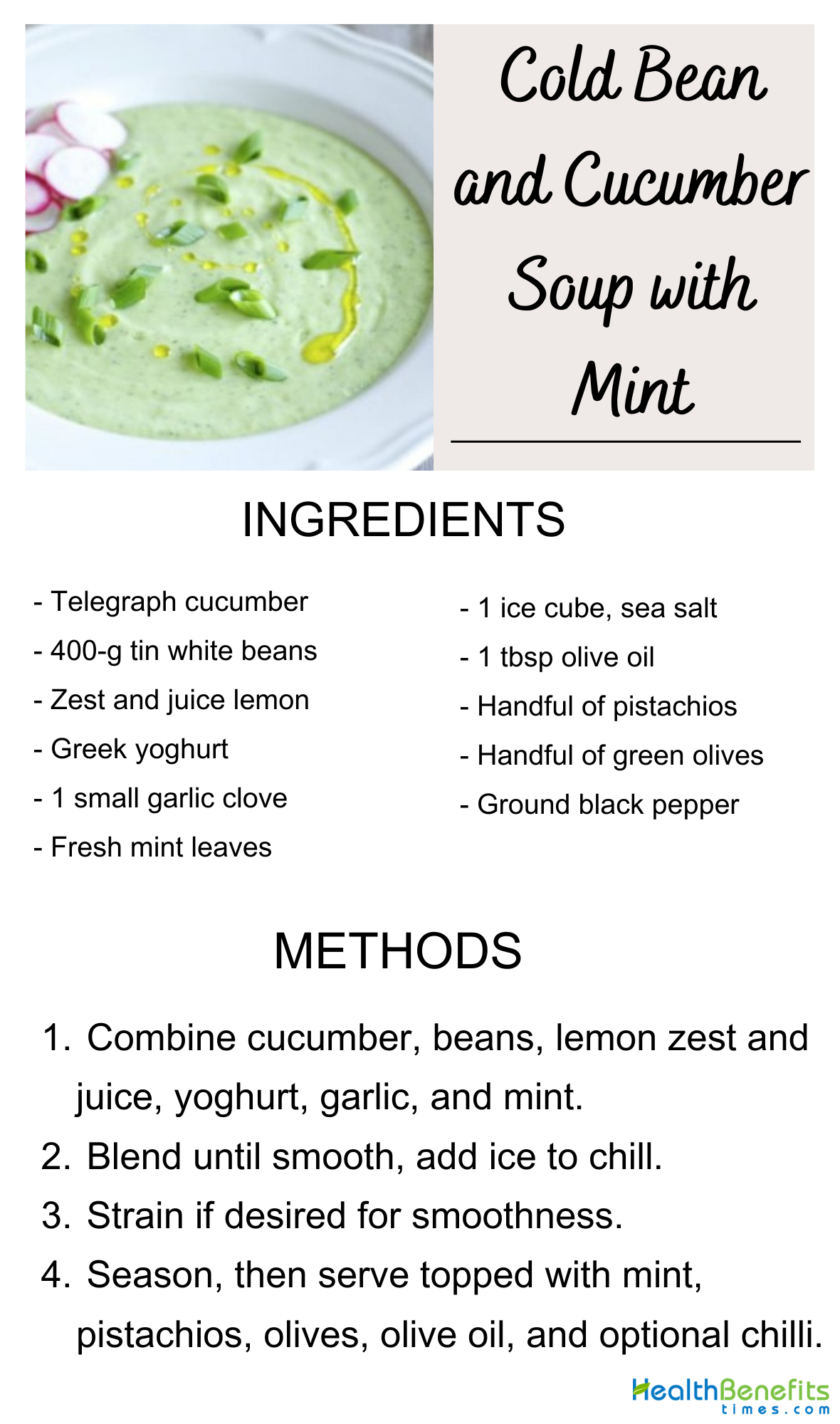 Cold Bean and Cucumber Soup with Mint is a refreshing dish perfect for 2. It's made by grating a large cucumber and mixing it with rinsed white beans, the zest and juice of half a lemon, Greek yoghurt, and a small garlic clove. Most of the fresh mint leaves are added to this mix. Everything is then blended together, with an ice cube tossed in to cool it down quickly. For a smoother texture, you can strain the soup. It's seasoned with sea salt, black pepper, and olive oil to taste. Serve this chilled soup in bowls, garnished with the rest of the mint leaves, a handful of shelled pistachios, and sliced green olives for a crunchy texture and a pop of flavor. Drizzle a bit more olive oil on top for richness. If you like a bit of spice, adding diced green chili can introduce a nice heat.