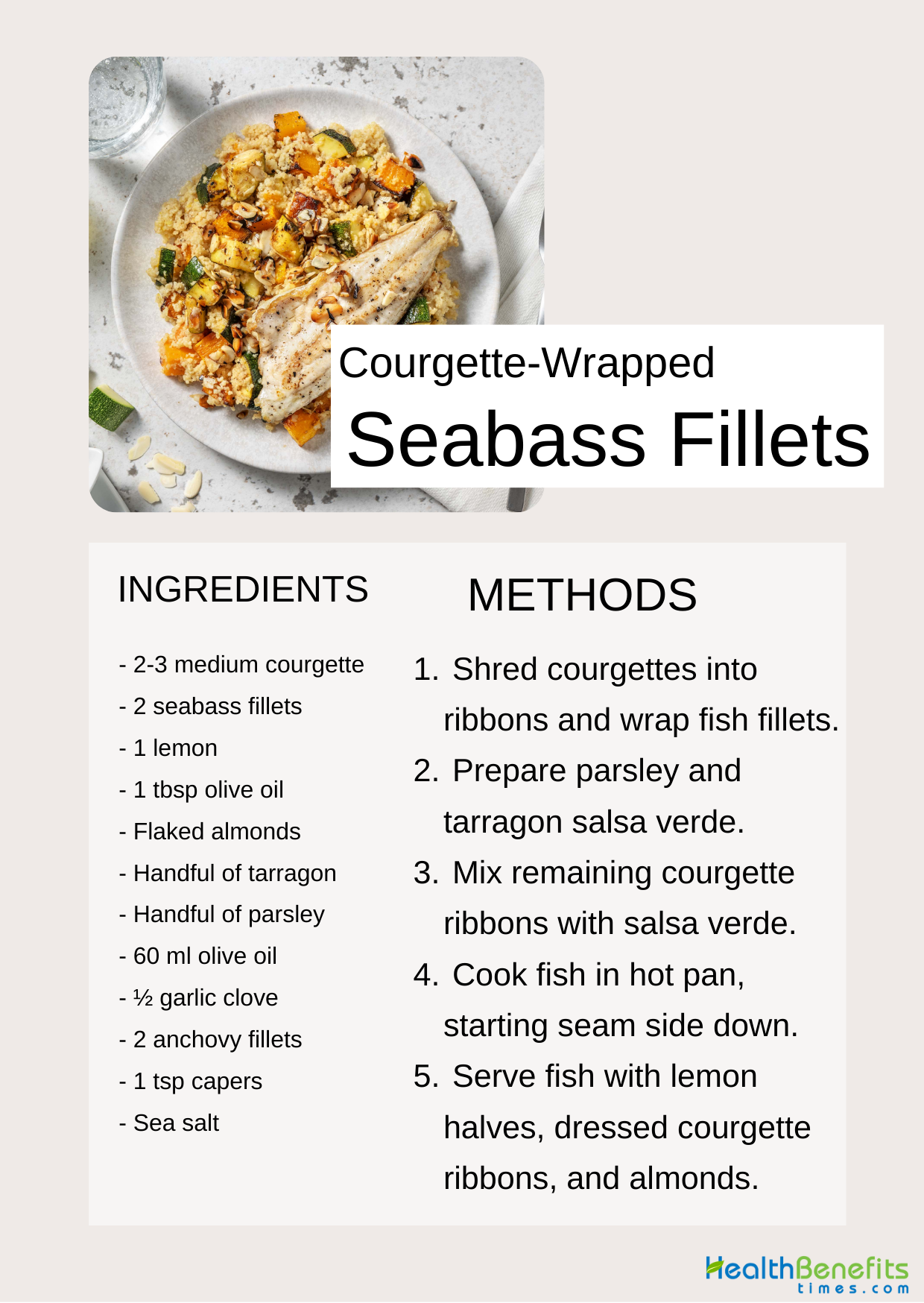 Present the cooked fillets alongside the dressed courgette ribbons. Garnish with toasted flaked almonds for crunch and serve with the grilled lemon halves, offering a smoky citrus note to the dish. This method combines the soft flavors of seabass with the freshness of courgette and the boldness of the salsa verde for a meal.