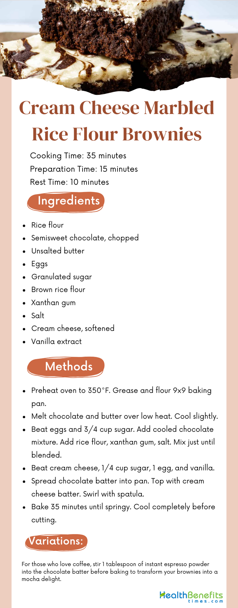 Cream Cheese Marbled Rice Flour Brownies, a gluten-free indulgence that has cream cheese with the chocolate. Perfect for those who is looking for classic brownie, this recipe uses rice flour and xanthan gum. With a prep time of just 15 minutes and a total time of an hour, you can yield 2 to 3 dozen of these treats. Combining granulated sugar, semisweet chocolate, and cream cheese, sprinkled by a hint of pure vanilla extract. Whether you're baking for a special occasion or a cozy night in, these brownies brings blend of flavors and textures.