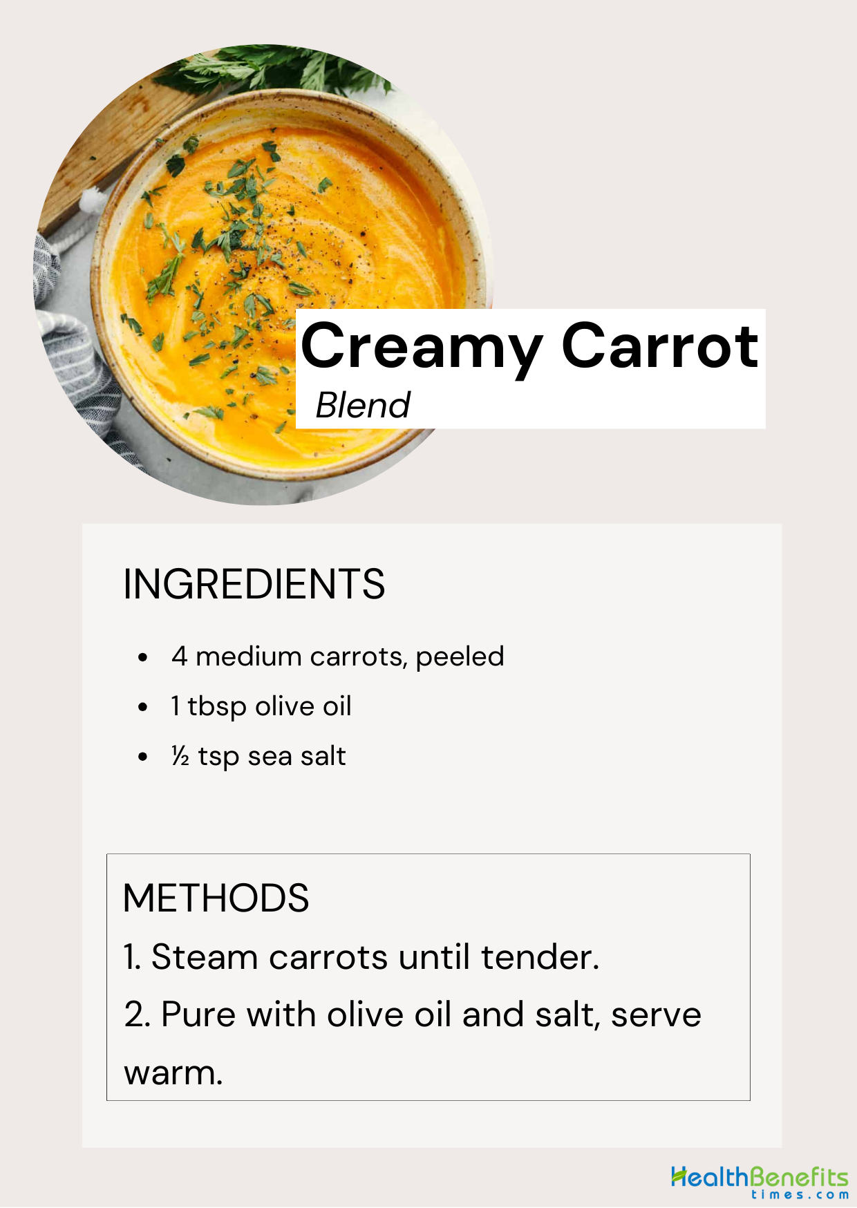 Creamy Carrot Blend is a simple and healthy side dish that serves 2. Begin with four medium-sized carrots. Peel them, dice them up, and then steam them until they're tender enough to be easily pierced with a knife. This normally takes about 20 minutes, but keep an eye on them to ensure they don't get too soft. Once they're perfectly tender, take them off the heat. The next step is to transform these steamed carrots into a smooth, creamy blend. To do this, put the carrots into a blender or food processor. Add a tablespoon of olive oil and half a teaspoon of sea salt. The olive oil adds a lovely smoothness to the pure, while the salt brings out the natural sweetness of the carrots. Blend everything until it's completely smooth. Serve this creamy carrot blend warm as a delicious accompaniment to your main dish. Its natural sweetness and smooth texture.