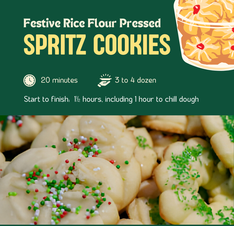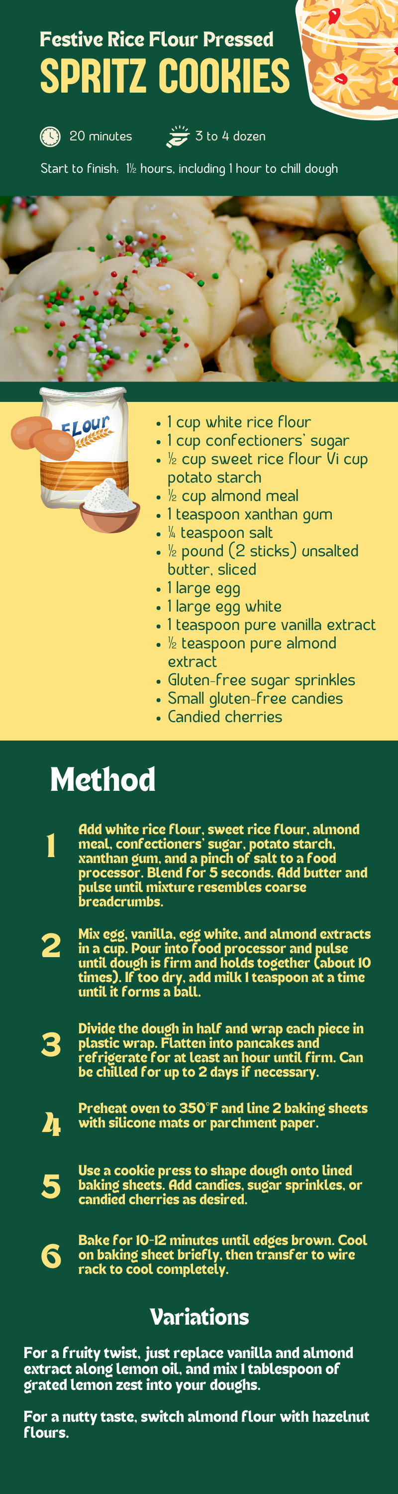 The Festive Rice Flour Pressed Spritz Cookies recipe is a gluten-free delight, yielding 3 to 4 dozen beautifully shaped cookies with a prep time of 20 minutes and a total time of 1½ hours, including dough chilling. This recipe combines white rice flour, sweet rice flour, almond meal, and potato starch with confectioners' sugar for sweetness, while xanthan gum and a touch of salt enhance texture and flavor. The dough, enriched with butter, egg, and aromatic extracts of vanilla and almond, is designed for a cookie press, allowing for intricate shapes. Decorate with gluten-free sprinkles, candies, or cherries before baking to golden perfection. Variations suggest a lemon zest twist or hazelnut flour for a different taste, making these cookies a versatile and festive choice for any occasion.
