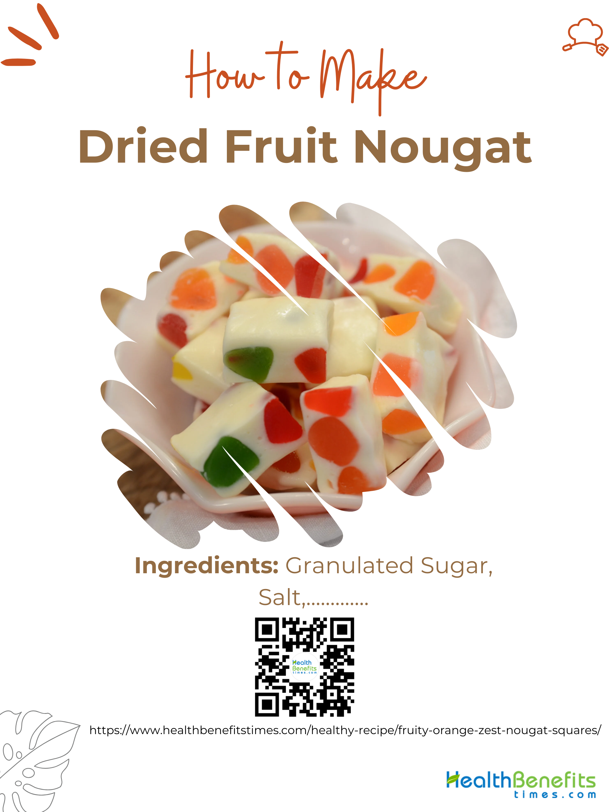 Nougat making is filled with oranges and mixed dried fruits in the Fruity Orange Zest Nougat Squares. This recipe, yielding 64 pieces, is a testament to the experimentation of candy making, blending whipped egg whites with sugar and corn syrup, all mixed with orange and dried fruits and candied citrus peels. With an active preparation time of 25 minutes and total period of 2 hours, including chilling. From preparation of the pan with foil to the finally cutting the set nougat into bite-sized pieces. The Fruity Orange Zest Nougat Squares invite you to homemade candy.