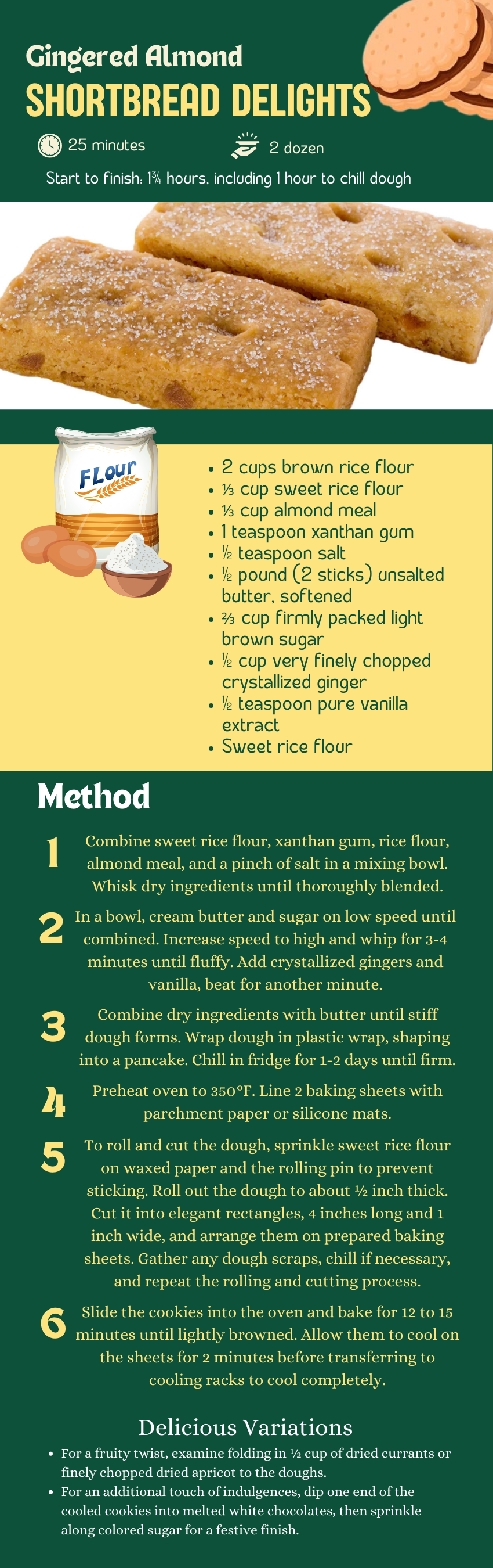 The Gingered Almond Shortbread Delights are a perfect blend of traditional shortbread with a spicy twist, yielding two dozen cookies. This recipe takes you on a culinary journey, starting with a simple mix of brown and sweet rice flours, almond meal, and a dash of xanthan gum for binding. The heart of this cookie lies in the creamy fusion of unsalted butter and light brown sugar, whipped to perfection, then elevated with the unique addition of finely chopped crystallized ginger and a hint of vanilla. After chilling, the dough is rolled, cut into elegant shapes, and baked until golden. For those looking to explore beyond the classic, this recipe offers variations with dried fruits or a dip in melted white chocolate, making these cookies a versatile choice for any occasion.