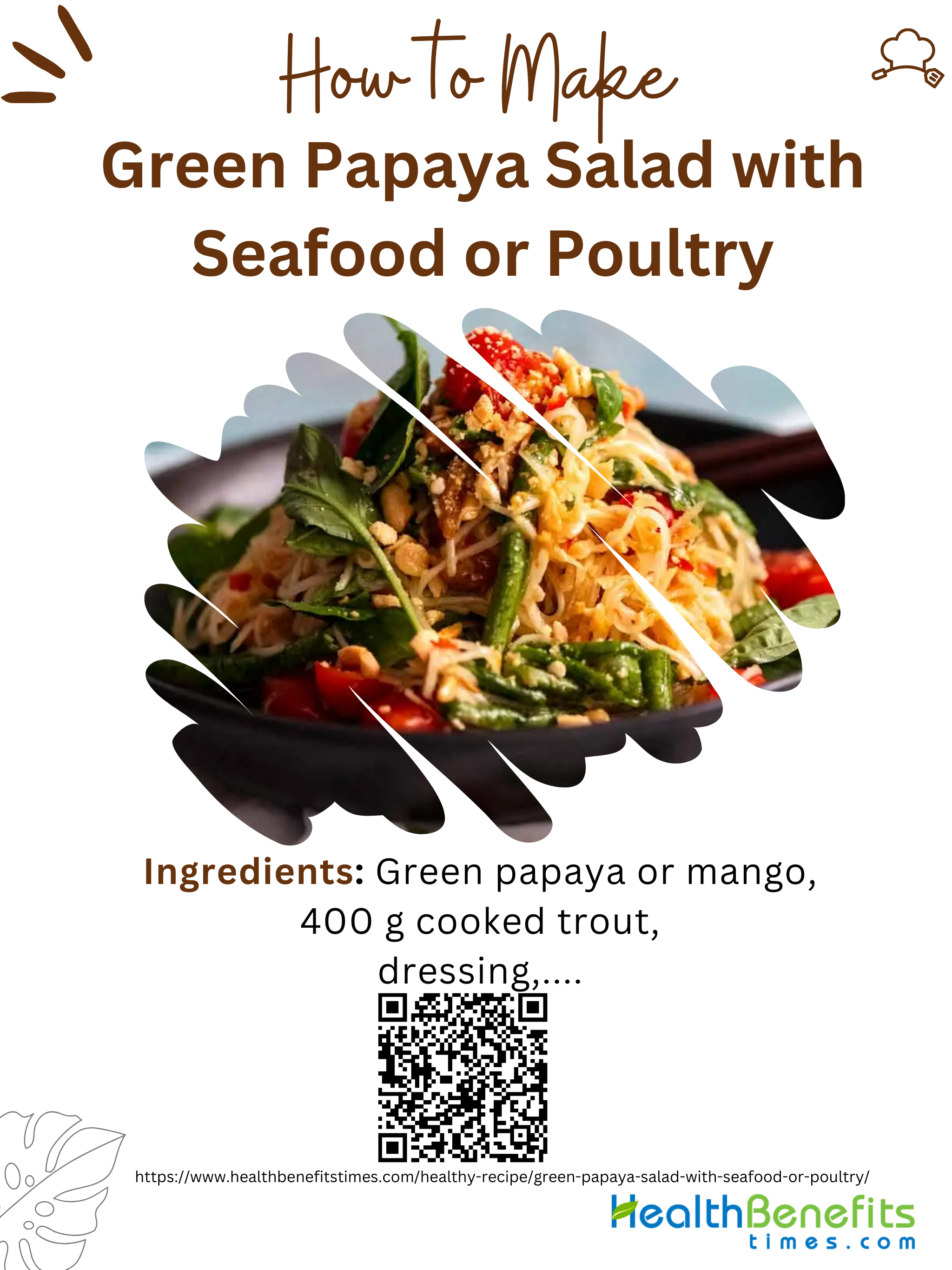 Mix the shredded papaya (or mango) with cooked seafood or poultry, chopped roasted peanuts, shredded spring onions, halved cherry tomatoes, and torn Thai basil leaves. Pour the prepared dressing over the salad ingredients and toss until well combined.