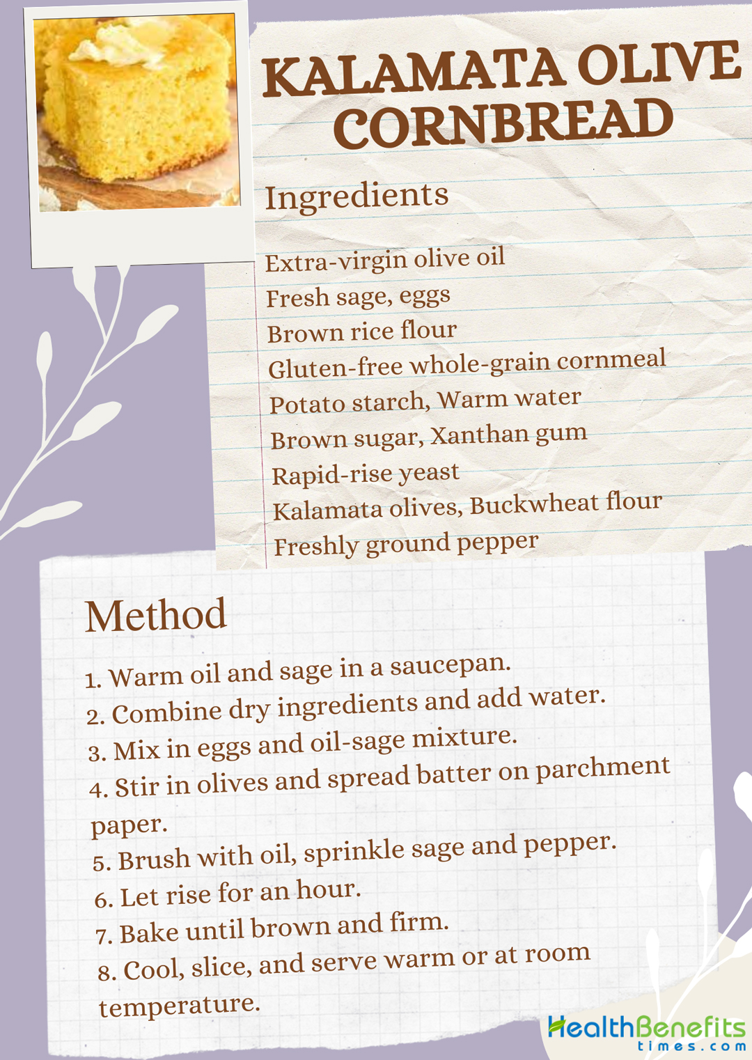 Olive & Sage Flatbread is a savory bread infused with the robust flavors of olive and sage. Its roots trace back to ancient Mediterranean cuisines, where olive oil and herbs like sage were normally used in bread-making. This flatbread fits well into various cuisines, including Mediterranean and gluten-free diets, making it versatile for different dietary preferences. Typically served as an appetizer or accompaniment to soups and salads, it adds a rustic charm to the meal. The major ingredients include brown rice flour, cornmeal, potato starch, buckwheat flour, Kalamata olives, and fresh sage, which are combined to form a thick batter. The batter is then spread onto a baking sheet, brushed with olive oil, and seasoned before baking until golden brown and fragrant. Olive & Sage Flatbread offers a delightful taste profile, with the savory notes of olives complementing the earthy aroma of sage, resulting in a flavorful and satisfying bite.