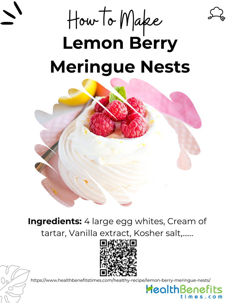 Lemon Berry Meringue Nests are a delightful dessert that combines the lightness of meringue with the fresh tang of lemon and the sweetness of berries. This dish has roots in classic European cuisine, particularly in the use of meringue, which has been a favorite for centuries. It's a versatile dessert that can be served in various courses and meal types, often seen in fine dining as well as casual settings. The major ingredients include egg whites, sugar, lemon (for the curd), and fresh berries such as strawberries and blueberries. The method involves whipping egg whites with sugar and cardamom to stiff peaks, forming nests, and baking until crisp. These nests are then filled with a tangy yogurt-Meyer lemon curd and topped with fresh berries. The taste of Lemon Berry Meringue Nests is a perfect balance of sweet meringue, sharp lemon curd, and the natural sweetness of berries, making it a refreshing end to any meal.