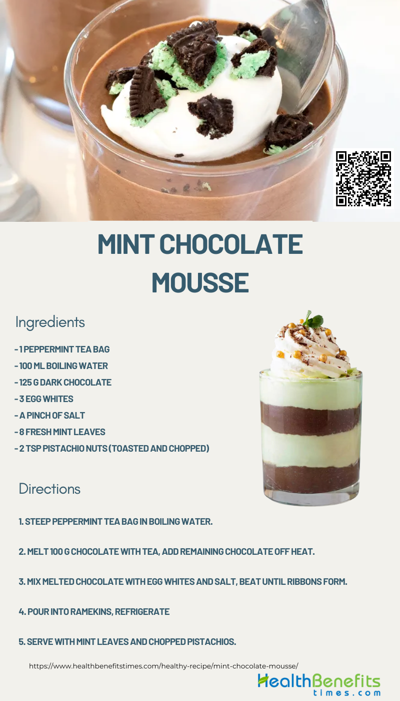 The Mint Chocolate Mousse is a delightful fusion of rich chocolate and refreshing mint, creating a dessert that's as luxurious as it is light. Beginning with the infusion of peppermint tea into boiling water, this recipe cleverly incorporates the essence of mint into the chocolate, ensuring every spoonful carries a subtle, refreshing flavor. Melting dark chocolate with the peppermint tea introduces a deep, robust taste, which is then tempered to enhance its texture and sheen. Whisking egg whites into the cooled chocolate mixture introduces airiness, transforming it into a silky mousse. After chilling in ramekins, the mousse sets into a perfect balance of dense chocolate and airy texture. Garnished with fresh mint leaves and toasted, chopped pistachios, it offers a crunch that contrasts beautifully with the smooth mousse.
