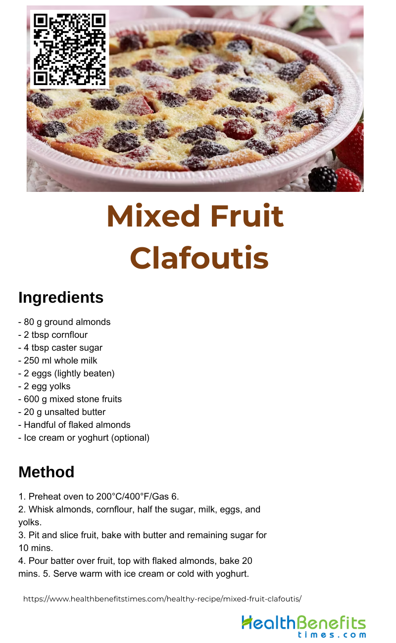 The Mixed Fruit Clafoutis is a delightful and easy-to-make dessert perfect for any occasion. Serving up to four people, this recipe calls for a blend of ground almonds, cornflour, caster sugar, whole milk, eggs, and a colorful mix of stone fruits such as plums, peaches, nectarines, apricots, and cherries. The process begins by preheating the oven and preparing a smooth batter from the dry ingredients, milk, and eggs. The fruits are then pitted, sliced, and laid in a pan, sprinkled with sugar and bits of unsalted butter, and baked to soften. The batter is poured over this fragrant base and finished with a sprinkle of flaked almonds, baking until the clafoutis puffs up nicely.