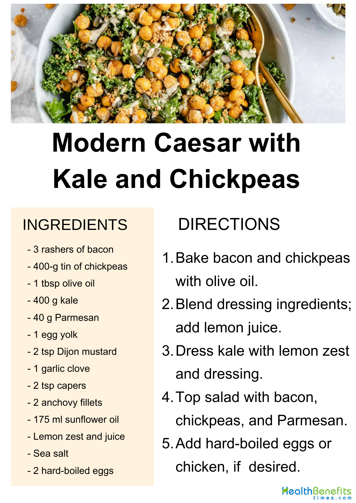This Modern Caesar with Kale and Chickpeas is a refreshing take on the classic Caesar salad, perfect for serving up to six people. It kicks off with baking crispy bacon and chickpeas together in the oven until they’re just right - the bacon crisp and the chickpeas with a nice crunch. While those roast, you'll whip up a tangy dressing in the blender using egg yolk, Dijon mustard, a clove of garlic, capers, and anchovies, all smoothed out with sunflower oil and brightened with lemon. The kale, stripped of its tough stems and cut into thin ribbons, acts as the salad's base, tossed with the homemade dressing and then crowned with the roasted bacon and chickpeas. Shavings of Parmesan add a salty depth. For those wanting an extra protein boost, adding hard-boiled eggs or some cooked chicken turns this dish into a hearty meal.