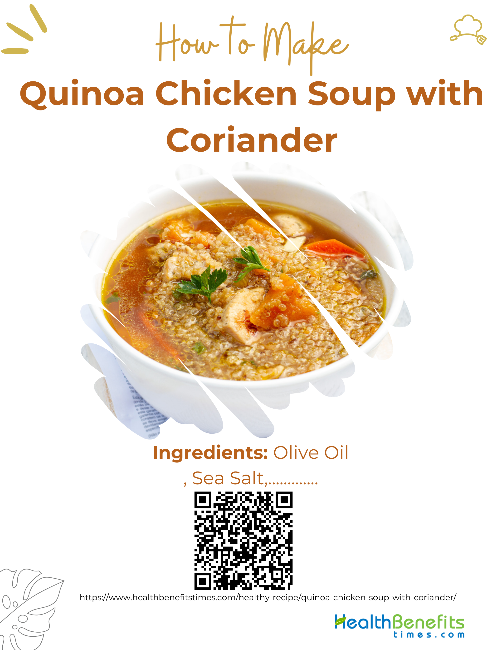 Quinoa Chicken Soup with Coriander is a dish that serves three. To start, fresh coriander stems are roughly chopped, keeping the leaves for later. These stems, along with an onion and garlic, are blended with olive oil into a paste. This mixture is then sautéed to enhance its flavors. Into this base, chicken stock is added and brought to a boil, followed by quinoa, which simmers under a lid for about 15 minutes. If you're using raw chicken, it's poached in the stock at this stage, then shredded once cooked. Frozen peas and the shredded chicken are warmed through in the soup afterwards. For a final touch, the reserved coriander leaves are pounded with some more olive oil and sea salt into a paste and stirred into the soup, infusing it with fresh herby flavors. Serve this comforting soup with lime wedges and, if you like a bit of spice, some finely chopped green chili.