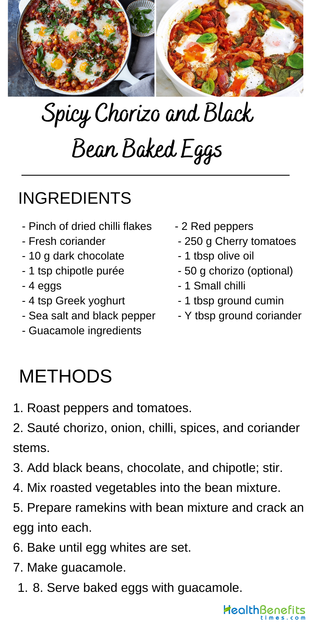 Make Spicy Chorizo and Black Bean Baked Eggs for a tasty meal for six. You'll need red peppers, cherry tomatoes, olive oil, chorizo, an onion, a small chilli, cumin, coriander, chilli flakes, fresh coriander, black beans, dark chocolate, chipotle, eggs, Greek yoghurt, salt, pepper, avocados, and lemon or lime juice. Start by roasting the peppers and tomatoes. Sauté chorizo, then add onion, chilli, and spices. Mix in beans, chocolate, and chipotle. Put the mix in ramekins, make a well, and crack an egg into each. Bake until the eggs are set but yolks are runny.