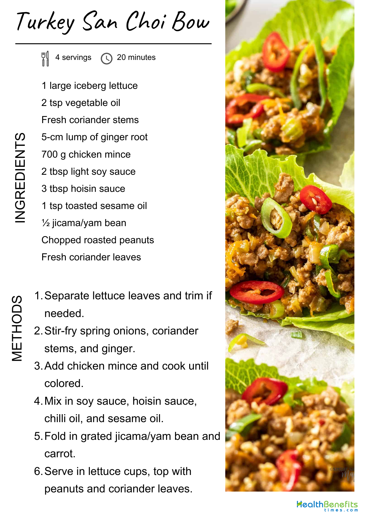 Turkey San Choi Bow is a delicious dish perfect for 4 servings. Begin by preparing the lettuce cups—cut the base off the iceberg lettuce and separate the leaves, then soak them in cold water to keep them crisp. In a wok over high heat, stir-fry spring onions, coriander stems, and grated ginger until softened. Add turkey mince and cook until it browns. Mix in light soy sauce, hoisin sauce, chilli oil, and toasted sesame oil for flavor. Fold in grated jicama/yam bean and carrot. Serve the flavorful stir-fry mixture in the lettuce cups, topping them with roughly chopped roasted peanuts and fresh coriander leaves for extra crunch and freshness. Don't forget to have napkins handy to catch any drips.