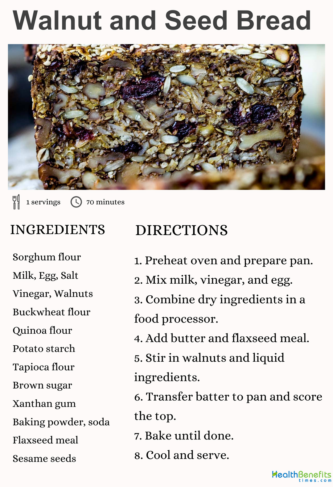 Whole Grain Walnut Bread is a nourishing bread that combines whole grains and the crunch of walnuts, offering a delightful texture and a boost of nutrition. With a history rooted in the tradition of using whole ingredients for health and flavor, this bread crosses cultural boundaries, making it a versatile addition to any meal. Whether it's breakfast, lunch, or dinner, it pairs wonderfully with a variety of dishes. The bread is made from a blend of sorghum, buckwheat, and quinoa flours, enriched with potato starch, tapioca flour, and flaxseed meal for added nutrition and texture. Walnuts add a nutty crunch, while a mix of milk, vinegar, and an egg binds the ingredients. The dough is seasoned with brown sugar, baking powder, baking soda, and salt, then baked to perfection. The result is a loaf that's not just visually appealing with its golden crust but also offers a hearty, slightly nutty taste, complemented by the subtle sweetness of the grains and the rich flavor of walnuts.