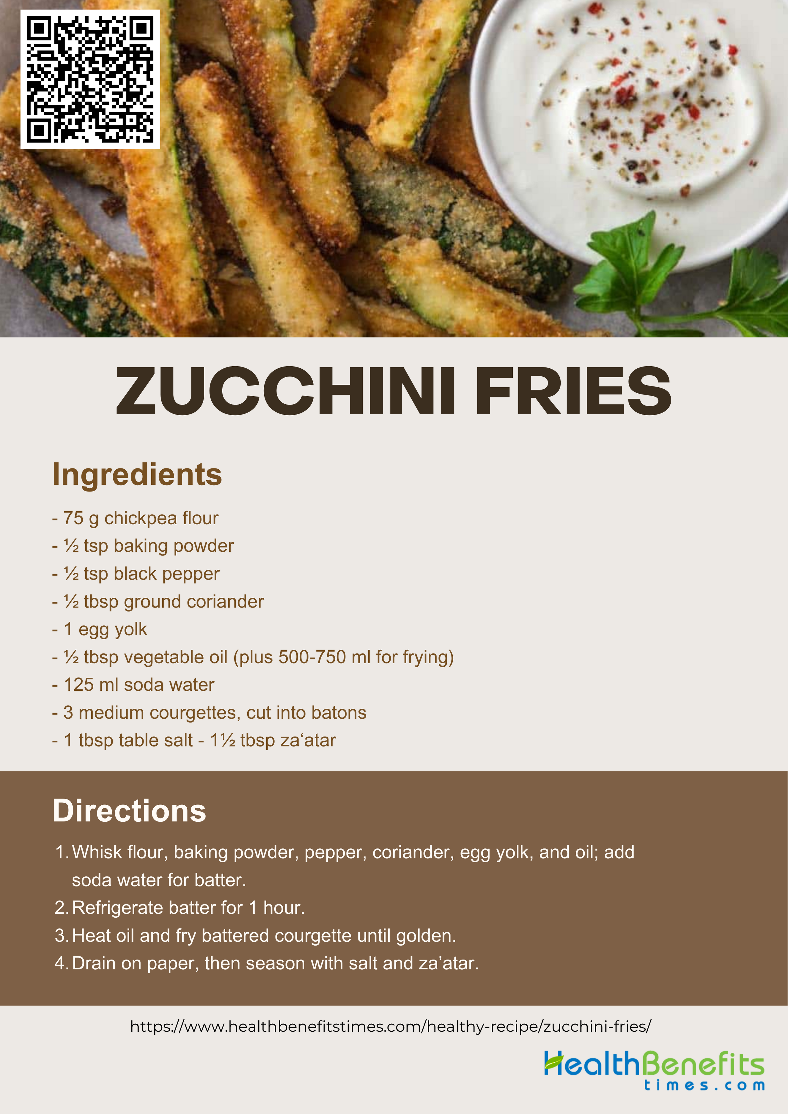 Zucchini Fries are a snack perfect for six people. To make them, you need chickpea flour, baking powder, black pepper, coriander, an egg yolk, a bit of vegetable oil, soda water, courgettes, salt, and za’atar. Start by mixing the flour, baking powder, pepper, and coriander. Add the egg yolk and oil, then slowly mix in soda water. Chill this batter in the fridge for an hour. When it's time to cook, heat a large amount of oil in a saucepan. Dip courgette slices into the batter to coat them well, then fry them in the oil, which takes about 4 minutes. After frying, place them on paper towels to drain off any excess oil. Before serving, season them with salt and za’atar. For an extra touch, serve with a simple sauce made from yogurt, olive oil, and lemon juice.
