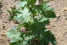 The leaves of the basal rosette are alternate and often have stalks almost as long as the blades. The stem leaves are alternate, shallowly lobed, and gray-green with conspicuous pale veins. Covered with short, sticky hairs, the leaves have a foul odor.