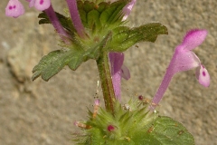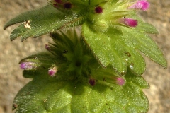 Flowers are in whorls of 4 to 10 at the top of the plant and at leaf axils in the upper half of the stem. Individual flowers are ½ to ¾ inch long, pinkish-purple, irregular with 2 lips at the end of a long, slender tube. The lower lip is divided into two rounded lobes. Each lobe has a dark purple spot in its center. The upper lip is shaped like a hood. The outside of the corolla is pinkish purple. The inner portion is white with purple spots or lines. Inside the tube are 4 stamens. The calyx surrounding the base of the tube is 5-lobed, densely hairy, and up to about 1/3 inch long. Henbit also produces inconspicuous cleistogamous flowers. These flowers never open and fertilize themselves. This plant flowers very early in the spring even in northern areas, and for most of the winter and the early spring in warmer locations such as the Mediterranean region. At times of year when there are not many pollinating insects, the flowers self-pollinate.