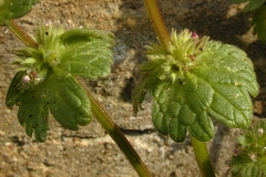 Leaves are opposite, up to 1 inch long and nearly as wide, hemispheric to nearly round to kidney-shaped, rounded at the tip, straight across to somewhat wedge-shaped at the base, with rounded teeth along the edges and sometimes with a few shallow lobes. Surfaces are sparsely hairy; lower leaves are petiolated, rounded to heart-shaped, with rounded teeth. Upper leaves are sessile, deeply lobed, encircling the stem at the base.