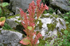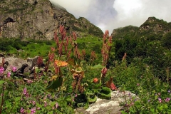 Himalayan Rhubarb is a multipurpose, endemic, robust perennial, endangered medicinal herb that grows about 1-3 m tall. The plant is found growing in alpine zone on rocky soil, moraines, and crevices, between boulders and near streams in specific pockets, grassy or rocky slopes and forest margins. The plant prefers a deep, organically rich, fertile, moderately heavy, humus rich, moisture retentive and well-drained soil. The plant has stout stems that are streaked green and brown, glabrous or pubescent at the nodes 1.5-2 m high.
