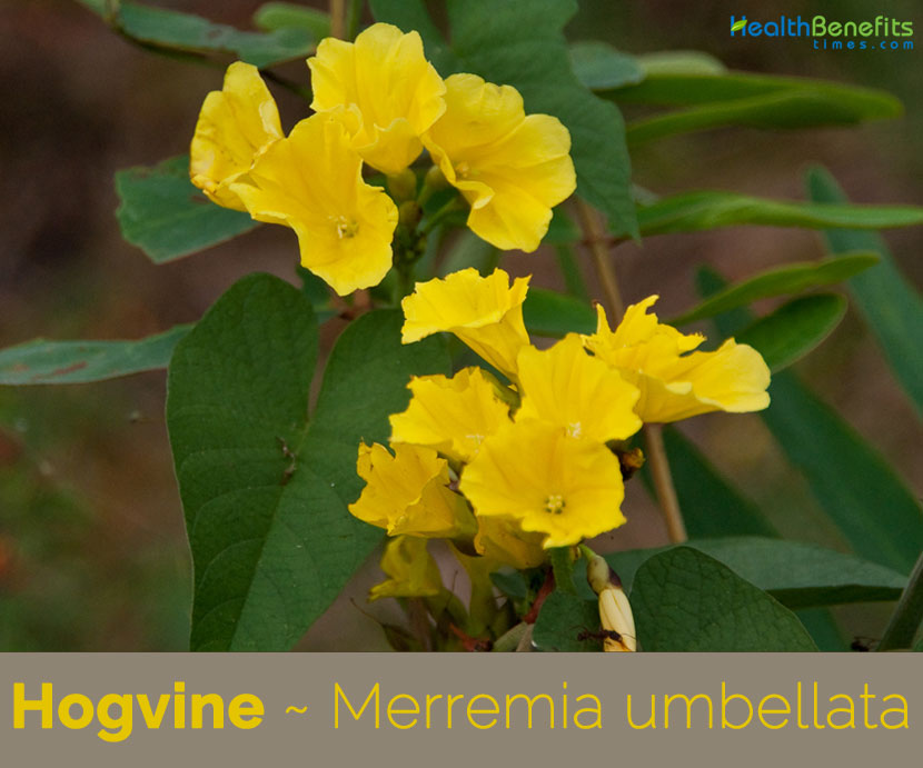 Hogvine, also referred to as Yellow merremia, Yellow wood rose has the scientific name Merremia umbellata is a twining, herbaceous plant belonging to Convolvulaceae family. The plant is native to Tropical East Africa, Seychelles, India, and Sri Lanka eastwards to China, Indo-China, Thailand, and southwards through Malesia to northern Australia. It occurs in America from Mexico to Paraguay, in the West Indies and in tropical West Africa. Hogvine, greater bindweed, Hog vine, yellow hog vine, yellow merremia, yellow morning glory and yellow wood rose are few of the popular common names of the plant.