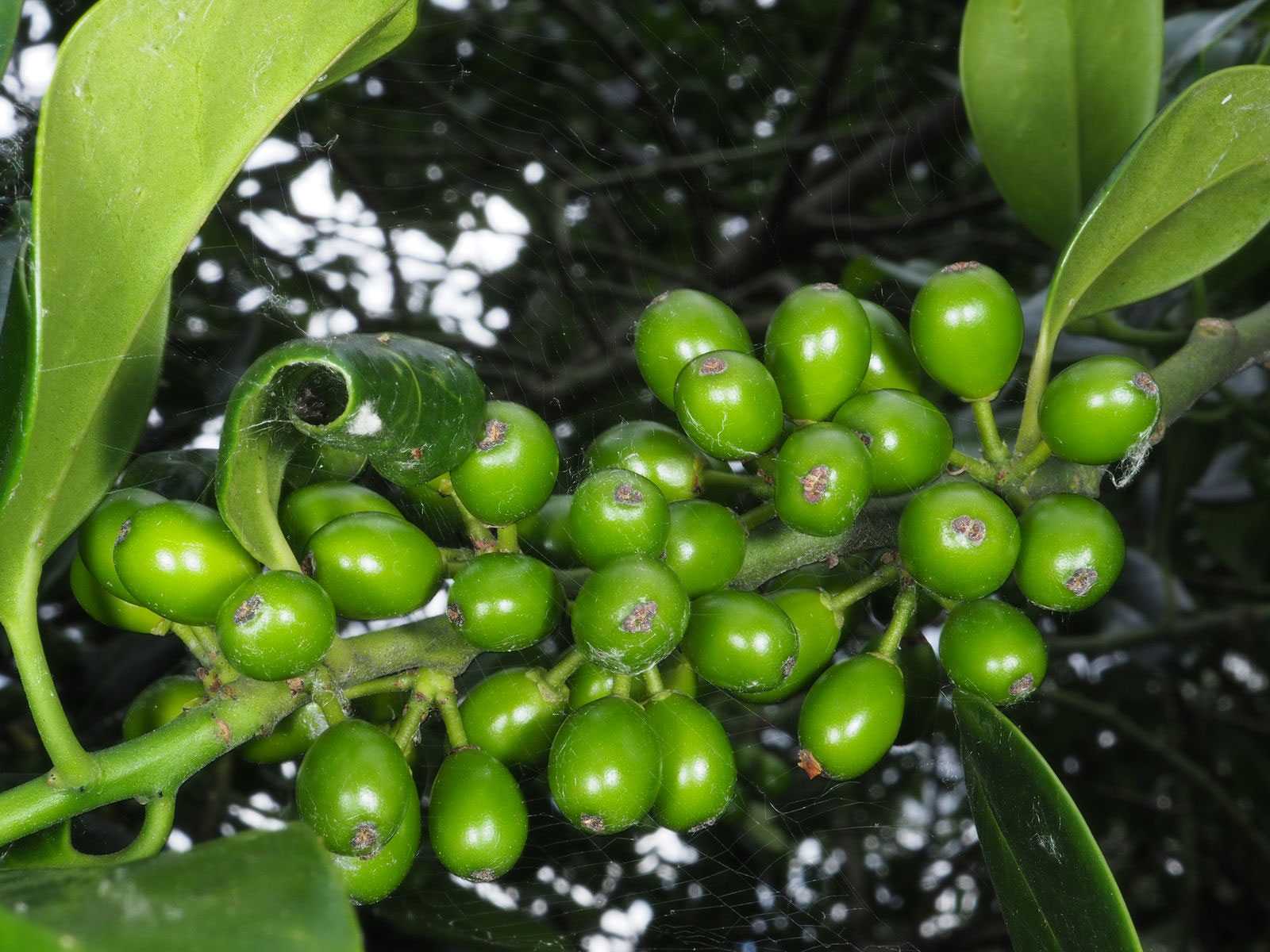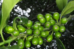 | Fruit Shape & Size | Berry like drupe (stone fruit), about 6–10 mm in diameter. They each contain four seeds, are usually borne in clusters, and are eaten by birds which disperse the seeds |