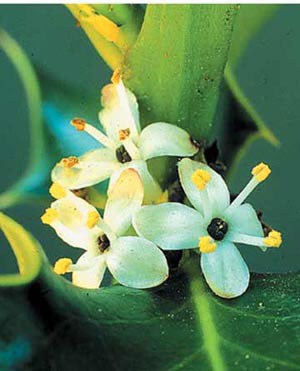 Small flowers are about 8 mm across and are usually borne in three-flowered clusters (occasionally 1-6 flowers in each cluster), which are thickly arranged into larger clusters in the leaf forks (i.e. axils). The plant is dioecious, meaning that there are male plants and female plants. The sex cannot be determined until the plants begin flowering, usually between 4 and 12 years of age. Separate male and female flowers are borne on separate plants. All flowers are borne on very short stalks (i.e. pedicels) up to 2 mm long. They have four tiny sepals which are about 1.5 mm long and four white or pinkish petals that are 2-5 mm long. The male flowers are yellowish and appear in axillary groups and have four stamens and a rudimentary ovary, while the female flowers are isolated or in groups of three and are small and white or slightly pink, and consist of four petals and four sepals partially fused at the base and have four partially formed stamens (i.e. staminodes) and an ovary topped with a short style and a globular stigma. Flowering occurs mainly during May to June.