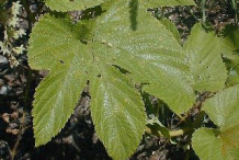 Opposite leaves are up to 6 inch long and 4 inch across; smaller leaves are usually oval-cordate in shape, but larger leaves are palmate with 3 lobes (rarely with 5). These leaves have a rough texture and coarse serration along the margins; they are medium green or yellowish green on their upper surfaces, and whitish green below. The long petioles are light green or light tan, stout, and prickly-bristly. At the base of each petiole is a pair of lanceolate stipules.