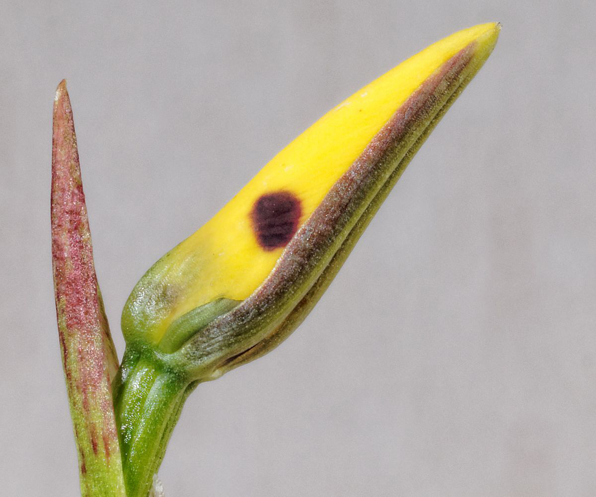 Flowers are bright yellow having deep red to brown markings on lower petal. Foliage is long and thin grass like. Tall flower spikes reaches 50 to 60 cm. Petals are erect, two stalked, yellow with brownish stalks and about 30 mm long. The plant thrives in well drained and moisture retentive soil. It could be found in lower foothill, open woodland areas in natural habitat.