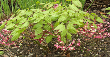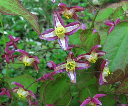 Horny goat weed is a dense, rhizomatous, clump-forming, usually deciduous perennial plant that grows about 10-15 inches tall and 18-20 inches wide. The plant is found growing in moist deciduous woodlands in the hills as well as calcareous rocks in moist woodland. The plant prefers average, acidic, dry to medium moisture, well-drained soils in part shade to full shade. It also prefers loose, organically rich loams with consistent moisture in part shade. The plant has bright red stems.