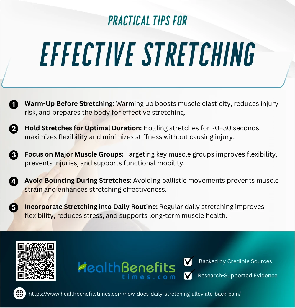 Effective stretching requires more than just movement; it’s about proper technique and consistency. By following practical tips like warming up, maintaining correct posture, and avoiding overexertion, you can maximize the benefits of your stretching routine. These strategies ensure safe, productive stretching for improved flexibility, reduced tension, and long-term back pain relief.