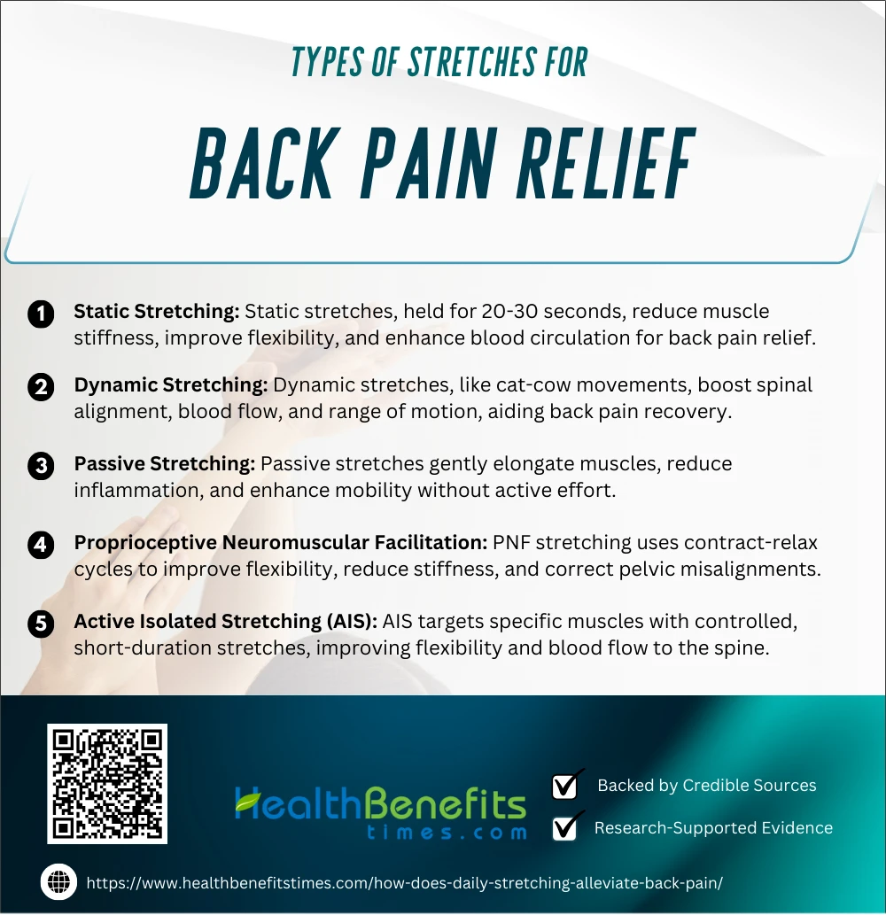 Active Isolated Stretching (AIS) helps alleviate back pain by targeting specific muscle groups through controlled, short-duration stretches. Research shows AIS improves flexibility, reduces stiffness, and enhances blood flow to the spine, making it effective for both chronic and acute conditions (35). It is particularly beneficial in improving hamstring and lower back flexibility (36).